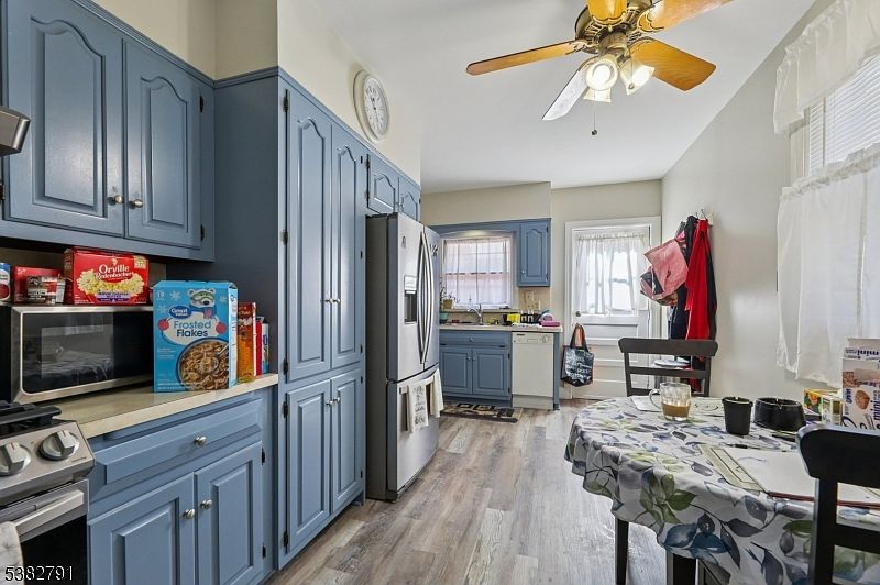 A cozy kitchen space features blue paneled cabinetry with silver hardware, stretching across the left wall and around the sink area in the back. The countertops are light and neutral, partly used for storing kitchen appliances and breakfast items such as cereal and popcorn. Stainless steel appliances, including a large refrigerator, add a modern touch. The breakfast nook to the right includes a small round table with a floral tablecloth, surrounded by two chairs. Light wood flooring unifies the space, while soft white walls and sheer curtains at the windows lend an airy, inviting atmosphere. A ceiling fan with warm-toned blades hangs overhead.