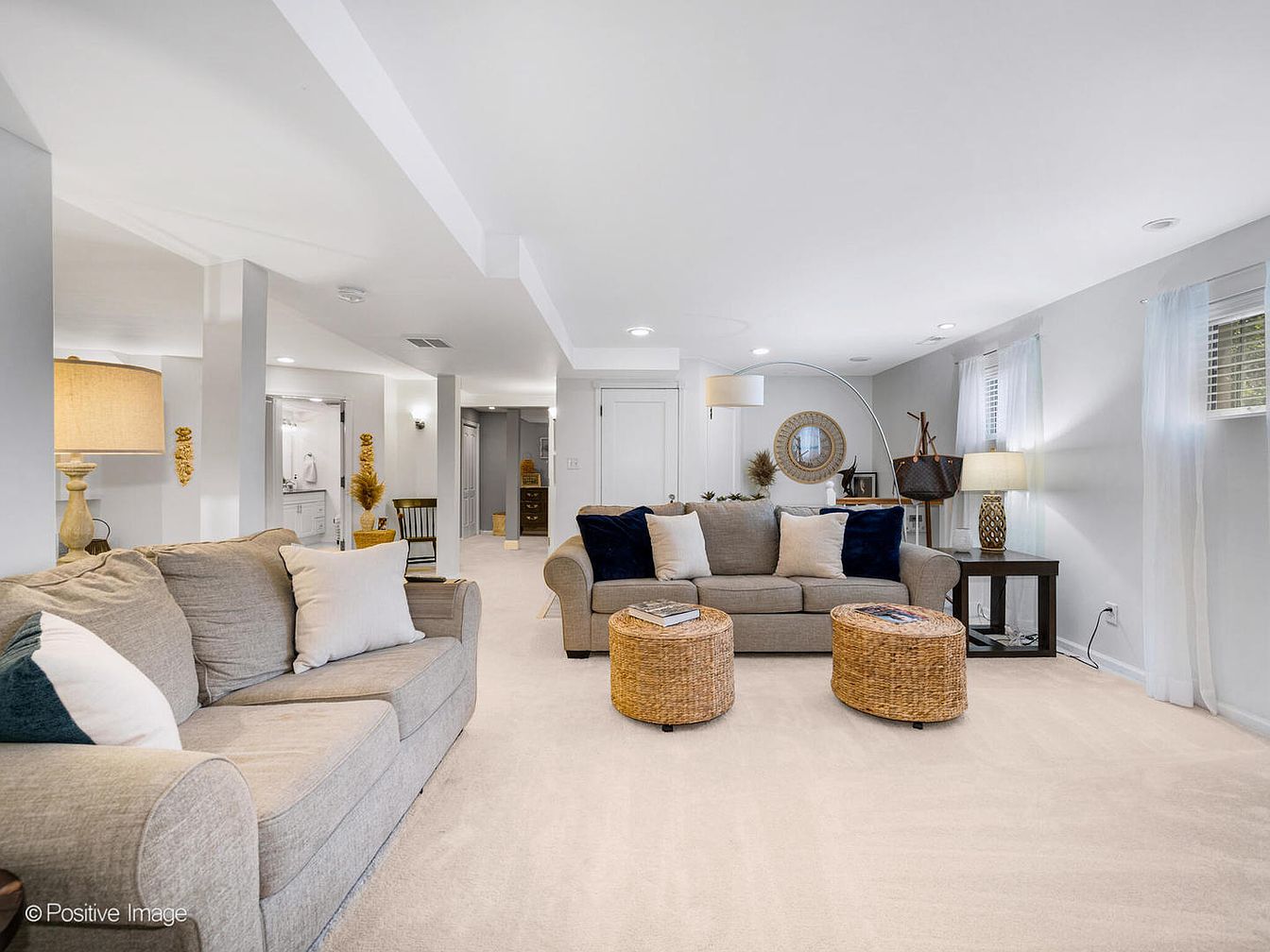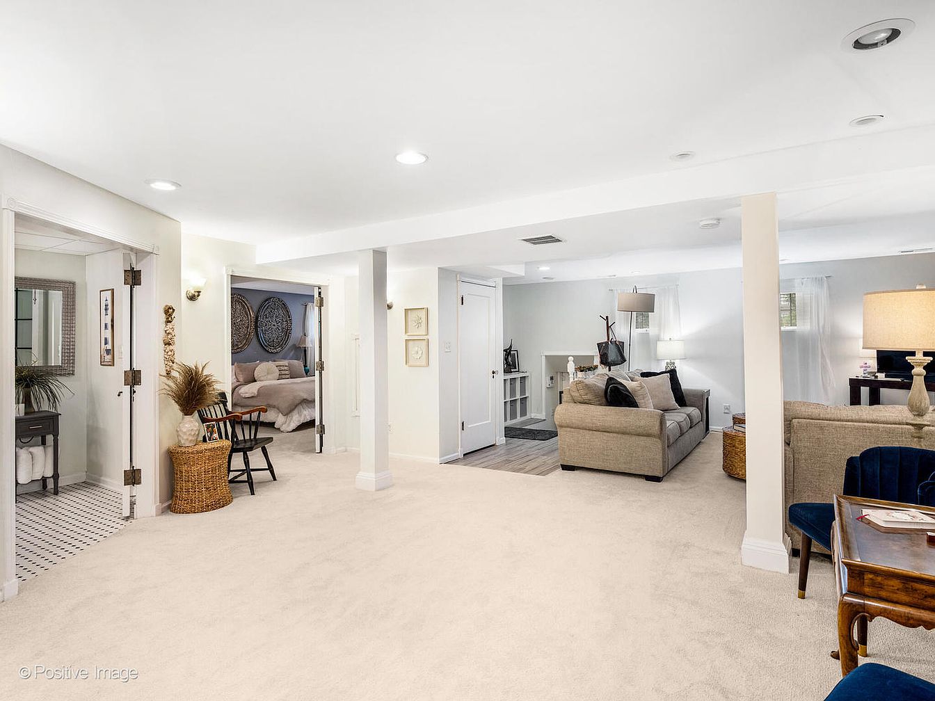 A spacious basement lounge featuring a soft beige carpet that enhances the cozy atmosphere. To the left, double doors lead to a bathroom with a stylish dark gray vanity. Adjacent, a rustic wicker basket adds texture. In the center, a neutral-toned sectional sofa invites relaxation, complemented by two plush dark cushions. A contemporary lamp with a simple shade sits next to the sofa, illuminating the area. Across, a small table with a blue chair offers a pop of color. Light walls and large windows create an airy feel, while decorative wall art lends character to the space.