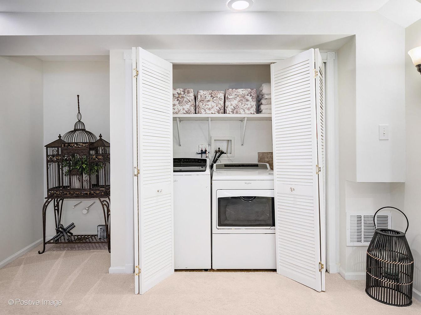 This laundry area combines functionality with vintage charm. A pair of white louvered doors discreetly reveal the washer and dryer, neatly arranged with adjacent shelves containing decorative storage boxes. The walls are painted a soft, neutral tone, enhancing the brightness of the space. A wrought-iron birdcage stands against one wall, adding a touch of elegance, while a potted plant brings a hint of greenery. The plush beige carpet contributes warmth and comfort, contrasting with the appliances. A modern black lantern accentuates the overall aesthetic, providing subtle illumination and tying together the room’s vintage and contemporary elements.