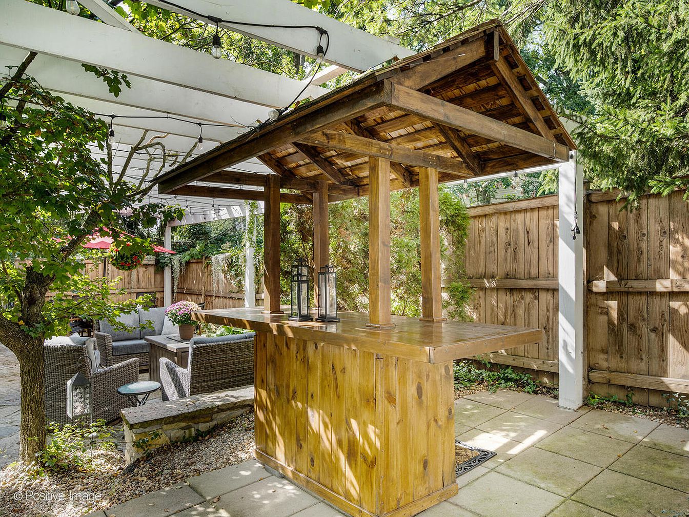 A serene garden patio space showcases a harmonious blend of nature and relaxation. Sunlight filters through lush green foliage, creating a dappled light effect on the stone patio. Comfortable outdoor seating includes modern chairs paired with a patterned rug, inviting leisure. A rustic wooden bar structure adds charm, accentuated by hanging lanterns. Vibrant planters display seasonal flowers, enriching the aesthetic with pops of color. Surrounding trees and well-maintained grass contribute to the inviting ambiance, perfect for gatherings or quiet moments. The pale walls of the house in the background provide a gentle contrast, enhancing the idyllic setting.