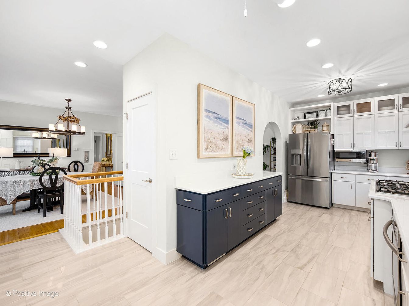 A modern kitchen flows seamlessly into an adjacent dining area. Dark blue cabinets contrast with white countertops, while the sleek stainless steel refrigerator enhances a contemporary vibe. Natural light floods the space from recessed lights, complemented by a stylish overhead pendant fixture. The floor features light-colored tiles that add warmth and enhance the spaciousness. To the side, a staircase with white railings leads to a cozy dining nook, adorned with a lace tablecloth and black chairs. Two framed landscape art pieces decorate the wall, adding a touch of elegance and inspiration to the inviting, functional layout.