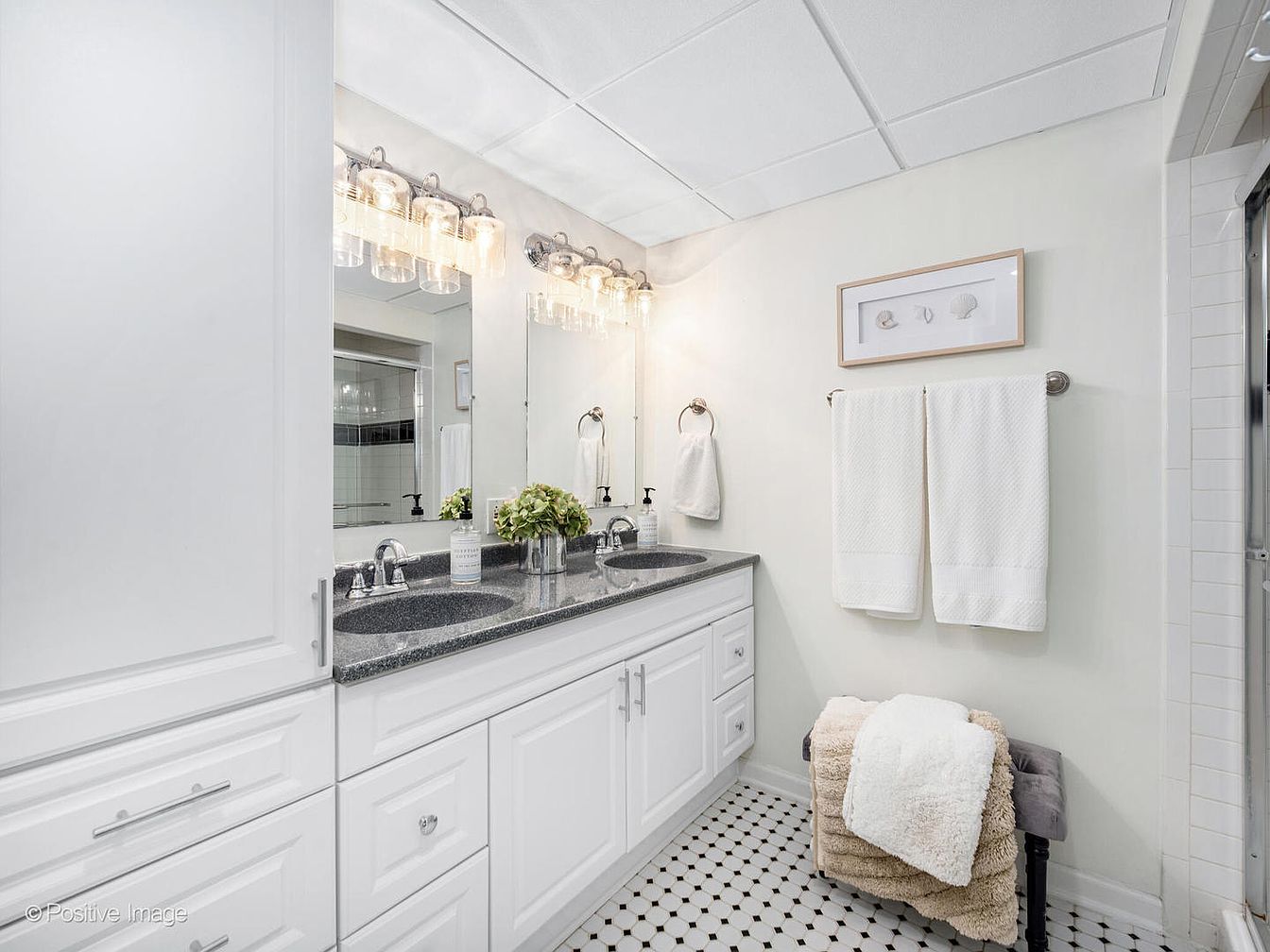 A modern bathroom features a sleek double vanity with crisp white cabinetry and a contrasting dark granite countertop. Above, a series of glass globe lights illuminate the space, reflecting off a large, framed mirror that enhances the room’s brightness. Neutral-colored walls complement the clean aesthetic, while a tiled floor in a classic black and white pattern adds a touch of elegance. Two plush, white towels hang neatly by a polished silver towel rack, with a soft cream-colored stool anchoring the vanity area. A small bouquet of greenery brings natural warmth and freshness to this tranquil space.