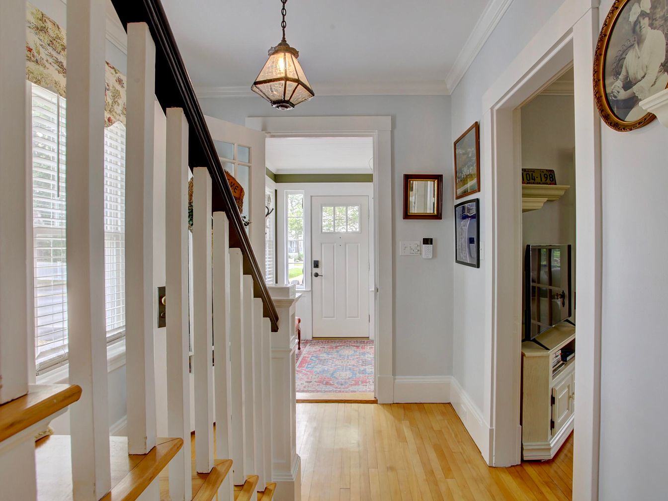 Natural light pours in from large windows fitted with white blinds on the left, illuminating the pale wooden floor and crisp white trim throughout the space. A dark wooden handrail and white spindles form a staircase that curves upward. Vintage elements include a hanging pendant lamp with a warm glow, framed black-and-white photographs and artwork on the walls, and a sepia-toned portrait in an ornate oval frame. The front door features geometric paneling and is topped by sidelights and a transom, leading into the foyer where an intricate, colorful rug adds a touch of classic charm to the welcoming atmosphere.