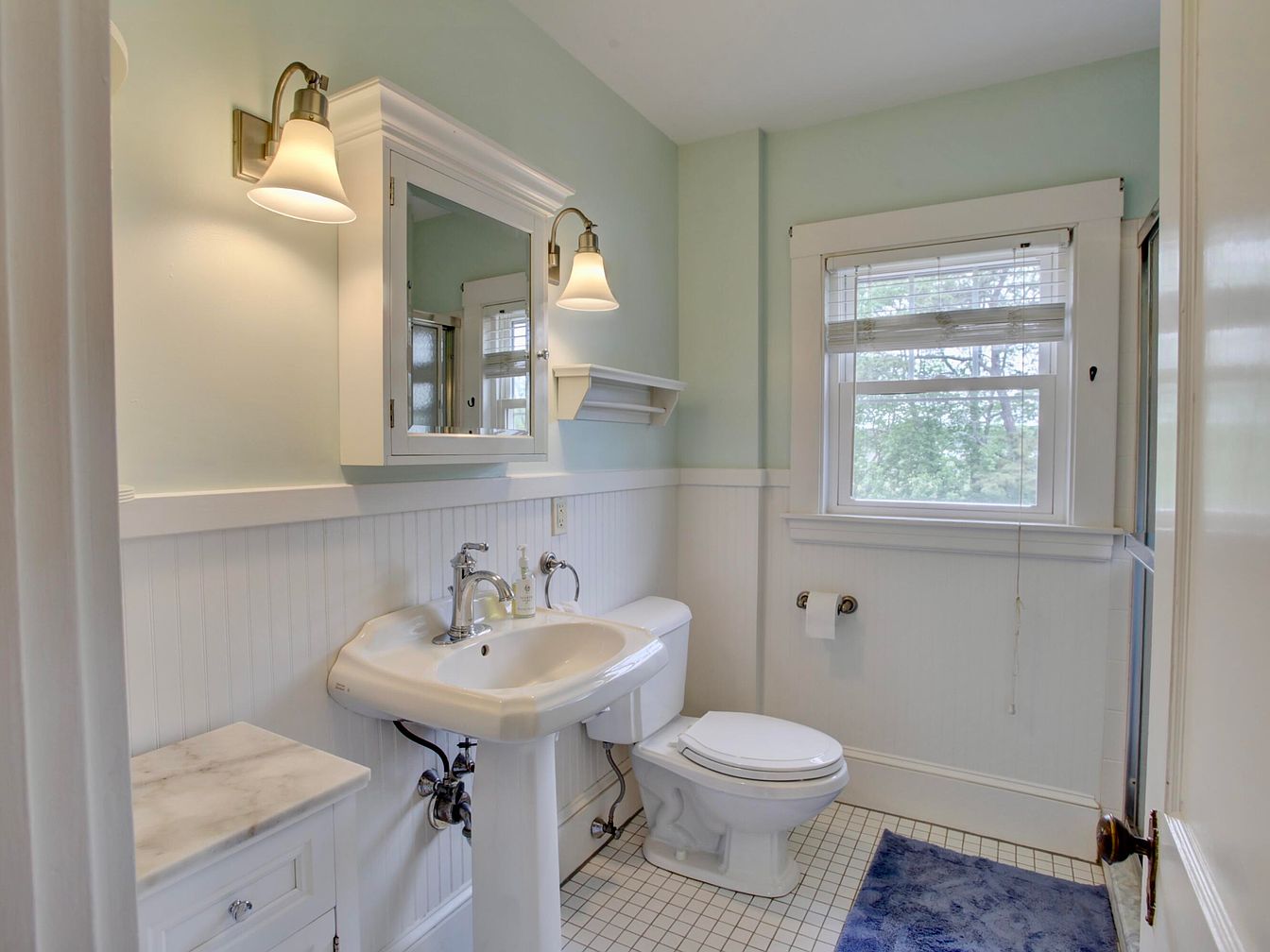 Soft pastel walls and white beadboard wainscoting create a fresh, airy ambiance. The pedestal sink is complemented by a classic chrome faucet and a rectangular medicine cabinet above, framed in crisp white. Two wall-mounted sconces with frosted glass shades flank the mirror, casting warm, inviting light. To the right of the sink, a white toilet is positioned beneath a wide, double-hung window fitted with sheer blinds, allowing natural light to brighten the space. A marble-topped side cabinet adds elegance, while a blue plush bath mat softens the white mosaic tile floor. The design embraces simple, historic charm.