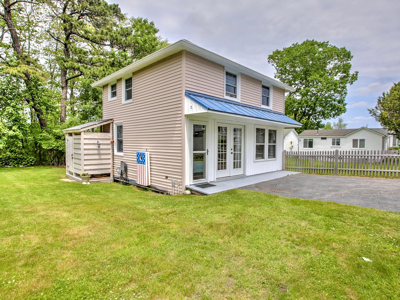 A two-story house with light beige siding and a blue metal roof sits adjacent to a well-kept grassy lawn. The main feature is a set of large double French doors with white trim, leading out to a small concrete patio and driveway. Several windows on both floors allow natural light to flood the home. A white picket fence encloses part of the yard, giving it a classic American charm. To the side, a small wooden privacy enclosure adds character and houses outdoor utilities. The scene is framed by mature trees, creating a peaceful, suburban atmosphere.
