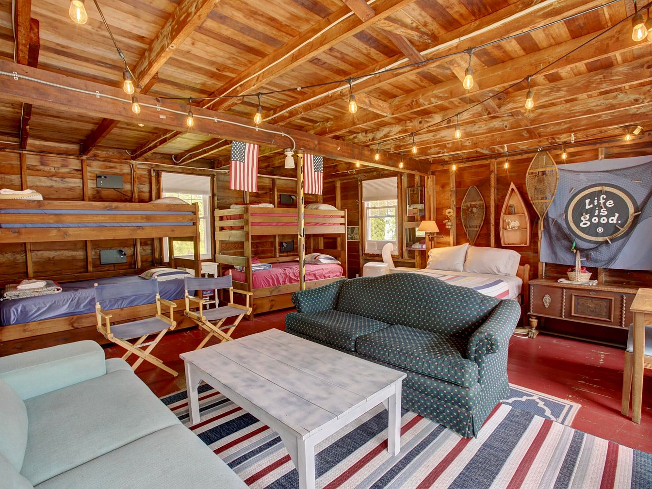 A spacious room with rustic wooden walls and an exposed beam ceiling, filled with natural wood bunks and furniture. String lights add a warm, welcoming glow overhead. Multiple bunk beds line one side, each with different colored bedding, while two director-style chairs and two cozy couches center around a weathered coffee table on a striped rug. Historic Americana is reflected in the U.S. flags and antique canoe paddles and snowshoes displayed as wall decor. A large ‘Life is Good’ banner and wooden dressers complete the casual, camp-like gathering space, merging comfort and nostalgia with playful, communal energy.