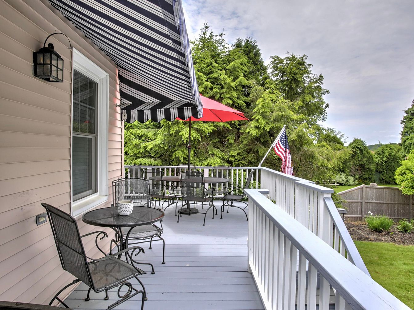 A spacious porch features pastel pink siding with white trim, complemented by a striped navy and white awning overhead for shade. Two black wrought iron bistro tables with mesh chairs create comfortable outdoor seating areas. To the right, a white railing lines the porch, leading down steps to a manicured lawn bordered by dense trees and shrubs. A bright red umbrella stands out above one table, while an American flag adds a patriotic touch to the setting. Soft gray decking harmonizes with the classic and inviting country house atmosphere, making this an ideal place to relax and enjoy the view.