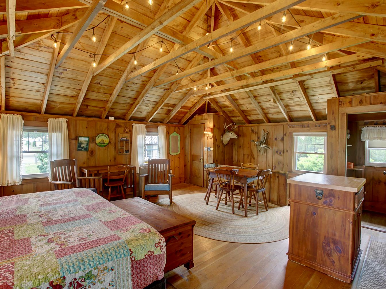 A spacious, open-concept bedroom loft with warm, honey-toned wood covering the floor, walls, and exposed beams of the vaulted ceiling. Hanging string lights are draped across the ceiling, enhancing the cozy, cabin-like atmosphere. In the foreground, a bed with a colorful patchwork quilt sits next to a wooden chest. The room includes rustic wooden furniture: rocking chairs, a small writing desk, and a round dining table set atop a braided rug. Natural light streams in through several windows draped with simple white curtains. Wall-mounted taxidermy and vintage accents complete the room’s rustic, welcoming feel.