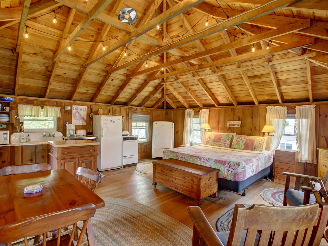 Warm wood tones fill the space, with open exposed beams across the vaulted ceiling and wide plank walls. A cozy patchwork king bed rests between windows dressed in lace curtains, flanked by wooden nightstands with glowing lamps. The kitchenette features a farmhouse sink, compact stovetop, and a vintage white refrigerator, capturing rustic charm. A square dining table with spindle chairs sits on a braided oval rug, complementing the wooden rocking chairs nearby. A simple chest sits at the foot of the bed, and mismatched rugs add homey touches. String lights provide gentle illumination, creating an inviting, nostalgic cottage atmosphere.