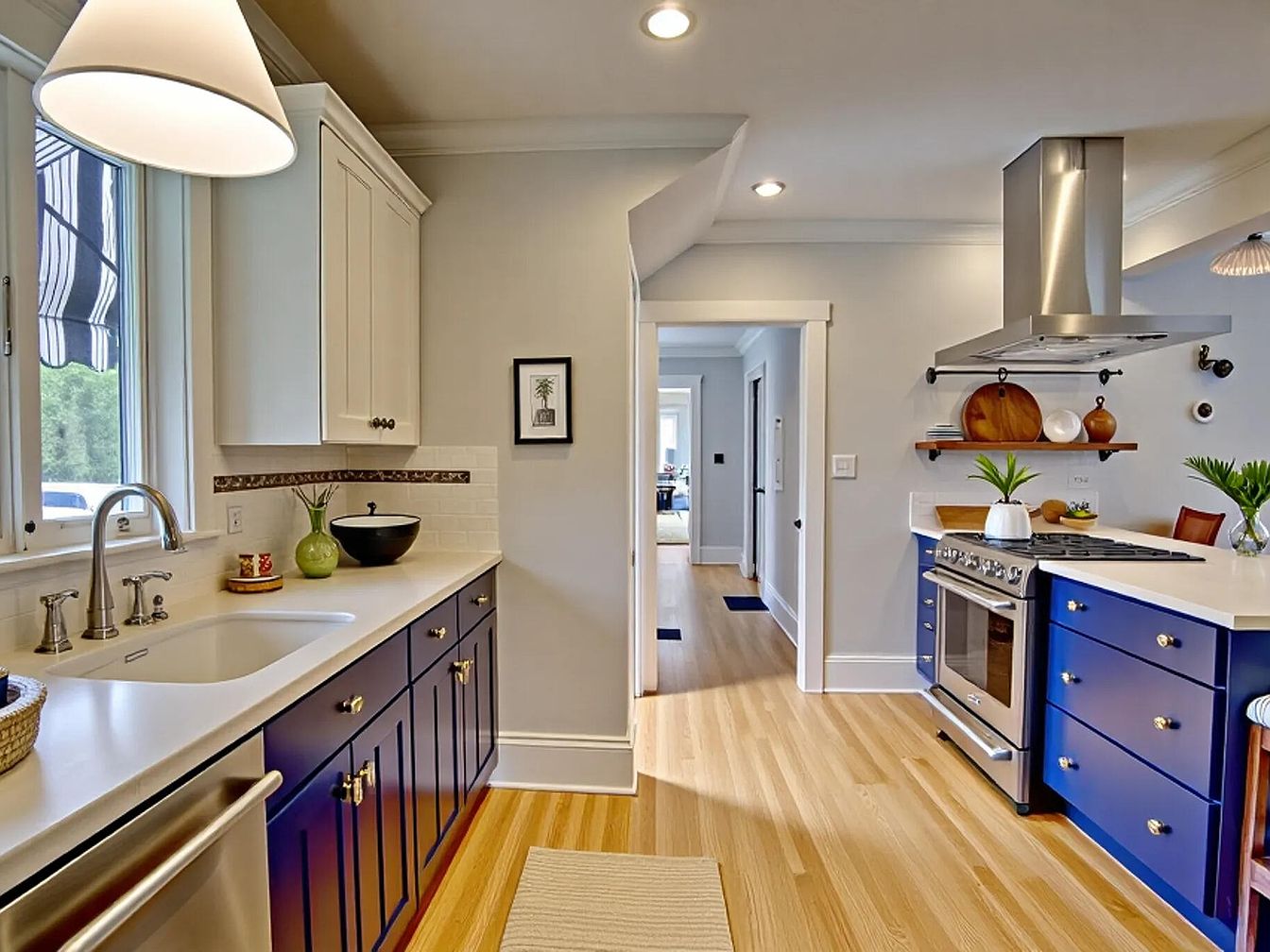 A bright, airy kitchen features navy blue lower cabinets, white countertops, and white upper cabinets. The floor is a light, natural wood that adds warmth to the space. A large window by the sink allows natural light to flood the room, complemented by a modern white pendant light. The backsplash is a simple glossy white tile with a subtle decorative band. The stove area includes a sleek stainless-steel hood and open wooden shelves with curated dishware and plants, adding a touch of greenery. The walls are a soft gray, enhancing the kitchen’s relaxed and inviting atmosphere.