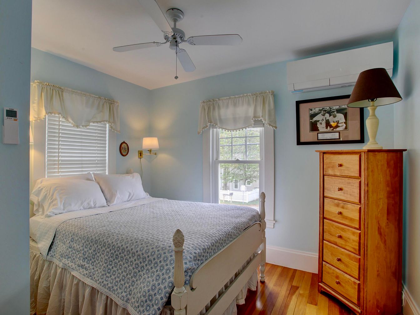 A cozy corner bedroom with pastel blue walls and abundant natural light from two large windows, each framed with ruffled white valances. A white-painted wooden bed with turned posts features white linens and a blue patterned quilt. Beside the bed, an elegant brass wall sconce adds soft, ambient lighting. Polished hardwood floors complement a tall wooden chest of drawers topped with a cream-colored lamp and decorative framed photo. Modern amenities include a wall-mounted air conditioning unit above the dresser. The overall aesthetic blends cottage charm with clean, airy simplicity, evoking comfort and tranquility in a thoughtfully arranged, restful space.