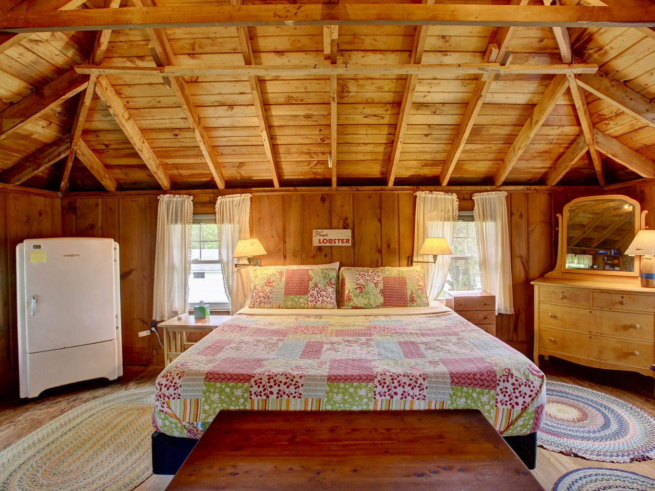 Warm wood paneling and exposed beams create a cozy rustic atmosphere in this bedroom. A large bed, centered in the room, features a colorful patchwork quilt in shades of green, red, and yellow. Two windows on either side let in natural light, with white curtained valances framing the views. To the left, an old-fashioned white refrigerator adds a vintage touch, while a wooden dresser with a curved mirror and lamp sits to the right. The room has two braided area rugs in neutral and multicolored tones, and small nightstands add practicality. Overall, the space feels charming and inviting, blending historical Americana with comfort.