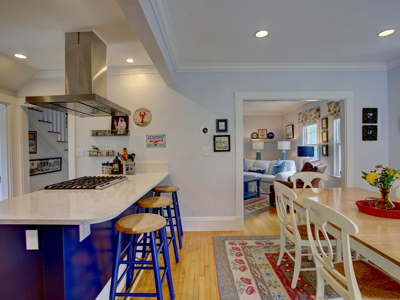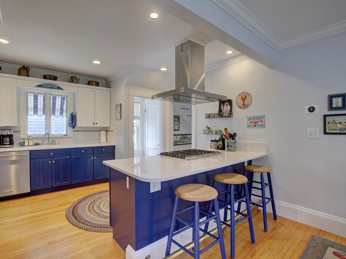 Bright kitchen showcasing a large island with a white marble countertop and three wooden bar stools painted navy blue. Blue lower cabinets contrast with white upper cabinets for a crisp, coastal look. Stainless steel appliances and a gas cooktop with a modern range hood add functionality and style. Nautical themed wall décor, such as seafood signs, enhances the relaxed, seaside feel. Natural light streams in through a window above the sink, which features a striped valance. The hardwood floors and a braided oval rug add warmth, while open shelving and decorative crockery provide subtle historic character.