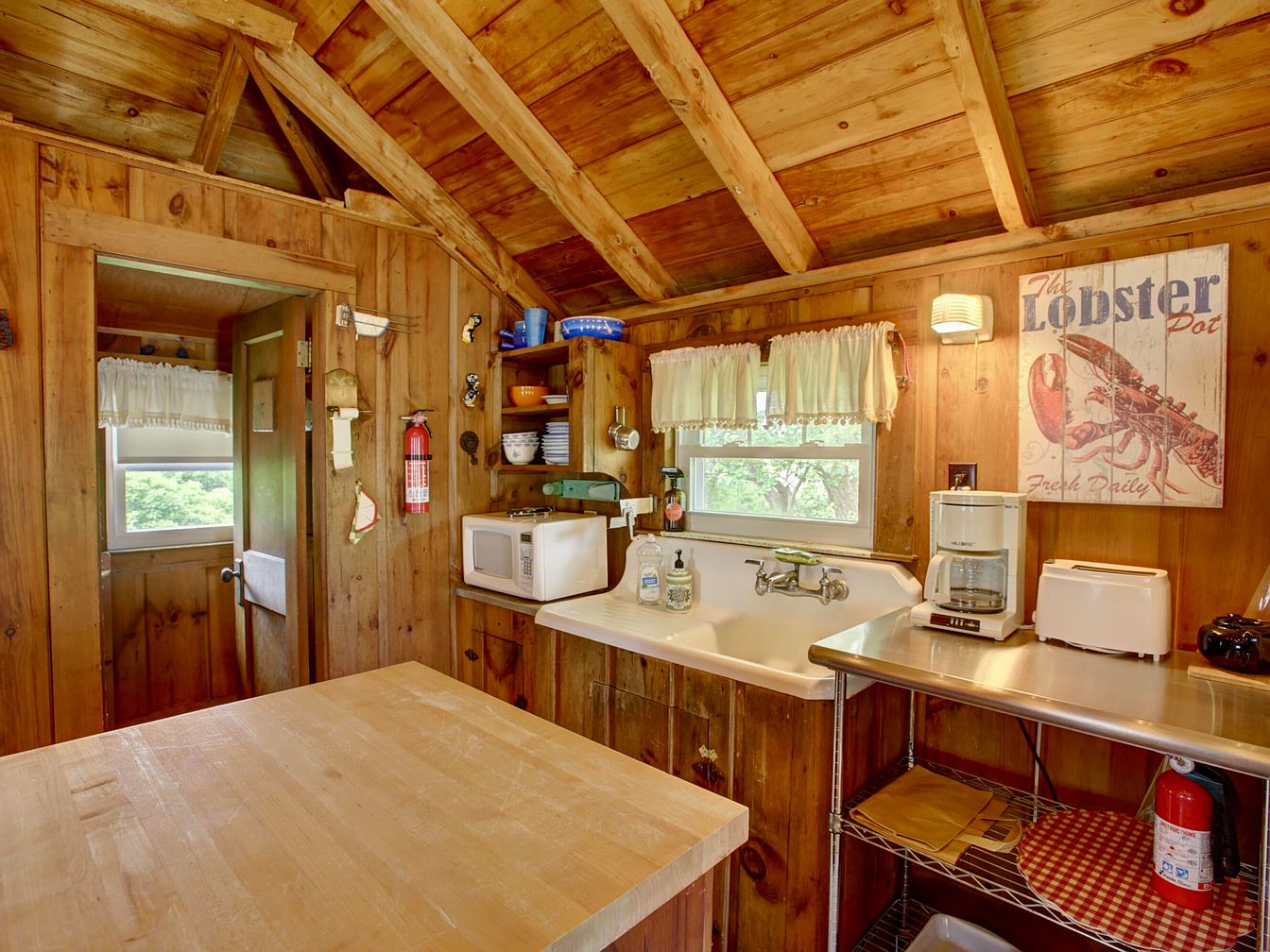 A compact and cozy kitchen featuring extensive use of natural wood on walls, ceiling, and cabinetry. Exposed beams and wood paneling create a warm, cabin-like atmosphere. The area includes a farmhouse-style white sink beneath a wide window with decorative lace curtains, allowing ample natural light. The countertop is butcher block, ideal for food preparation, while an adjacent metal utility table holds a coffee maker, toaster, and fire extinguisher for functionality. Open shelving displays colorful dishes and kitchen essentials. Vintage accents, such as a ‘Lobster Pot’ wall sign and curated kitchen tools, add a nostalgic, Americana feel.