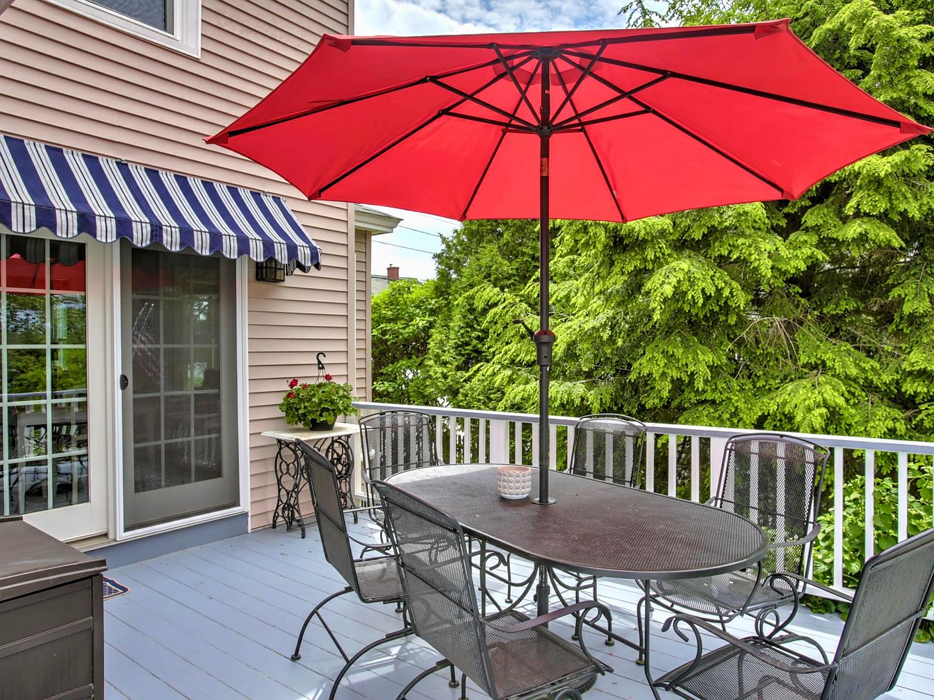 A bright outdoor patio features a powder-blue painted wooden deck with a white railing that frames lush, dense evergreen trees beyond. A large black metal dining table, paired with six matching mesh chairs, sits beneath a striking red umbrella that provides ample shade. Next to the sliding glass doors, which have grid-style panes, a small metal side table holds a cheerful potted plant with red blooms. Over the door, a navy and white striped awning adds a classic touch to the home’s beige siding. The scene is inviting, blending traditional charm with comfortable outdoor living.