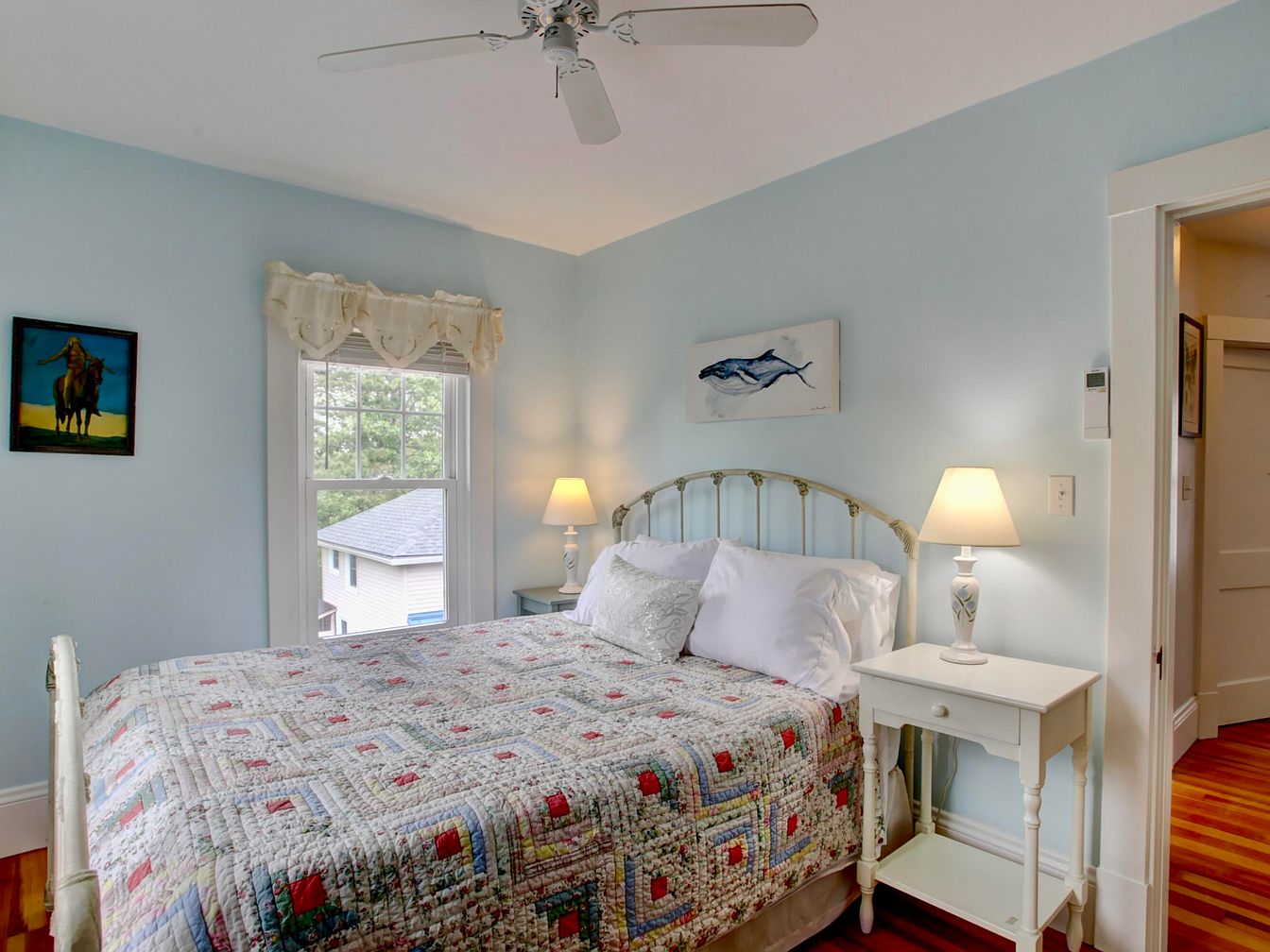 A cozy bedroom painted in soft pastel blue creates a soothing atmosphere. A metal bed frame with an ornate headboard anchors the room, dressed in a patchwork quilt with red, blue, and white tones. The bed is flanked by two white vintage nightstands, each topped with matching ceramic lamps casting a warm glow. A window trimmed with a ruffled cream valance lets in natural light, revealing a view of neighboring rooftops and trees. The floor is rich, polished wood, adding warmth beneath the bed. Artwork—a horse portrait and a whale painting—hangs on the walls, giving the space a touch of personality.