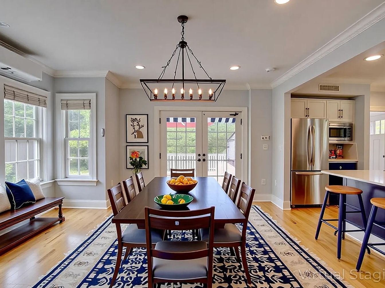 A spacious dining area features a large rectangular wooden table surrounded by eight matching wooden chairs, all set atop a blue and white patterned rug that adds vibrancy to the light hardwood floor. To the left, a built-in bench with navy and cream cushions sits beneath a row of three tall windows, inviting natural light into the room. Double glass doors with a black iron chandelier overhead open to a view of a deck and greenery beyond. The color scheme is predominantly soft grey walls with crisp white trim, blending seamlessly with the adjacent kitchen equipped with stainless steel appliances and blue-bottomed barstools at a breakfast counter. Framed artwork and a small floral arrangement complete the warm, inviting aesthetic.