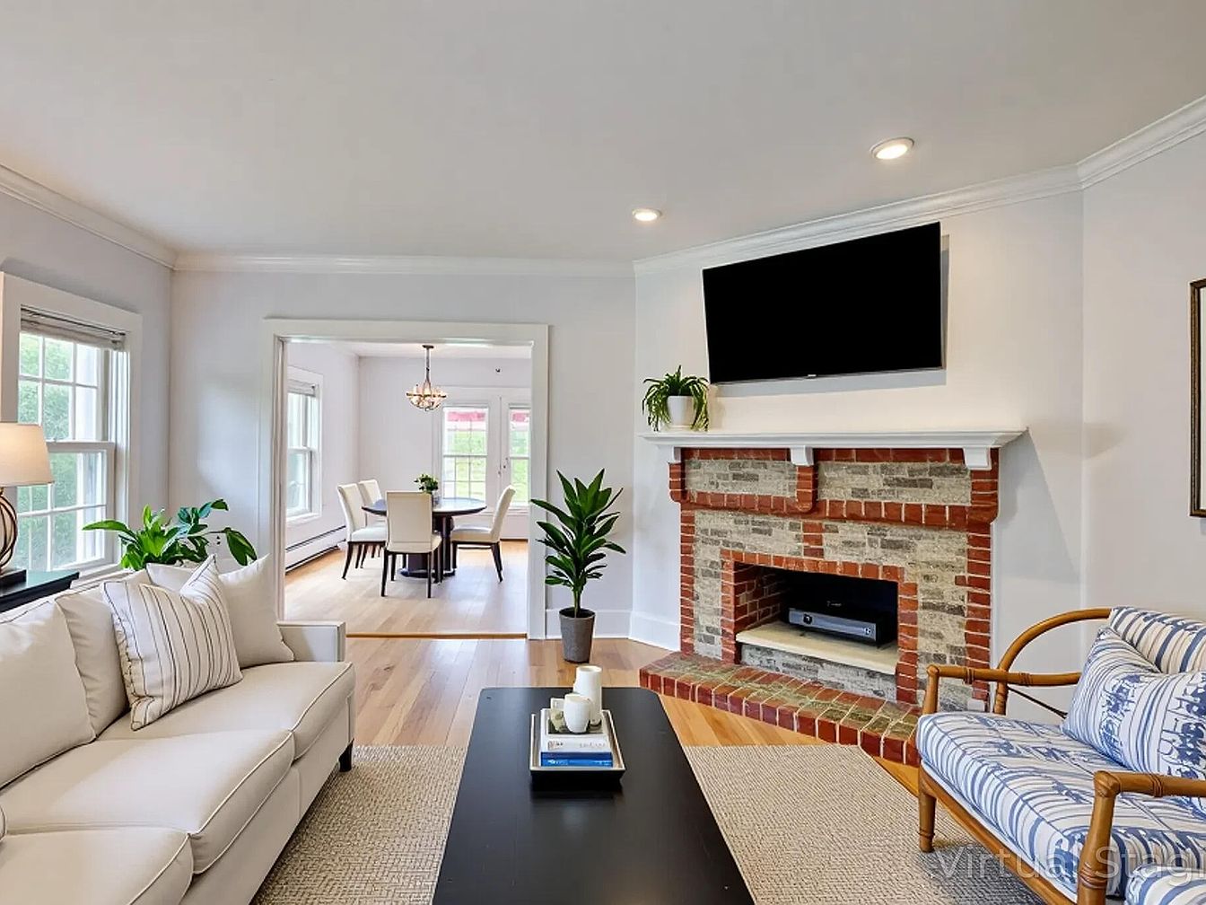 A bright and inviting living room showcases a traditional brick fireplace with a white mantel, topped by a wall-mounted television and accented with a potted plant. The walls are painted a soft, light gray, complemented by crisp white trim and crown molding. Large windows allow natural light to flood the space, brightening a white upholstered sofa with striped pillows and a modern dark coffee table. A woven beige rug covers the hardwood floors, and a cozy wooden armchair with blue patterned cushions sits nearby. Through an open doorway, a glimpse of the adjacent dining room reveals matching neutral decor and contemporary furnishings.