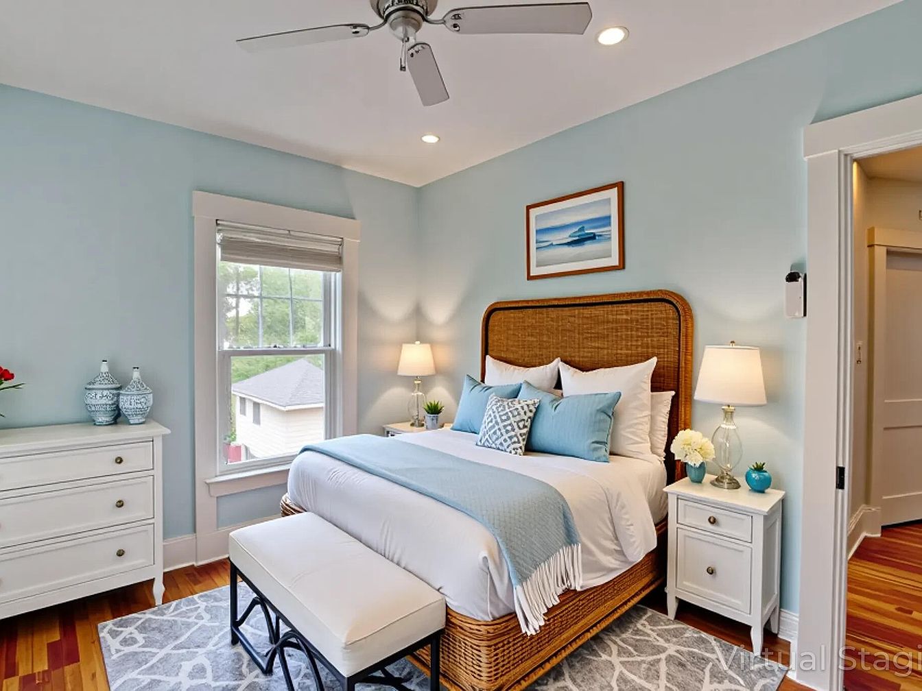 A tranquil bedroom with soft blue walls creates a calm, airy ambiance. The centerpiece is a bed with a woven rattan headboard, dressed in crisp white linens accented by light blue throw pillows and a matching throw blanket. Flanking the bed are classic white nightstands holding elegant glass lamps and fresh flowers. A white cushioned bench sits at the end of the bed, positioned on a soft, geometric patterned area rug. Natural light streams through a large window framed by white trim, illuminating the space and a white dresser topped with blue and white vases. The decor is fresh, coastal, and inviting.