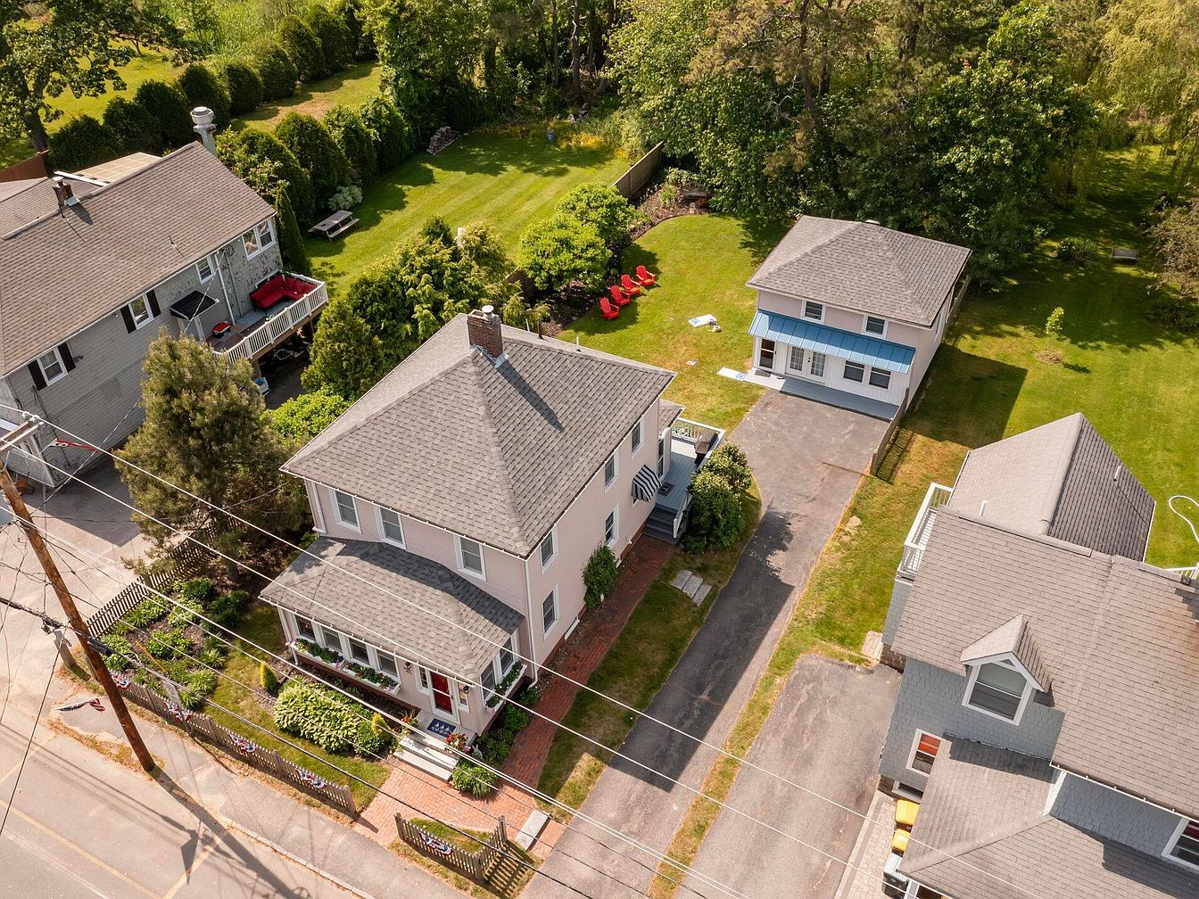 Aerial view of a charming historic property featuring a central two-story home with a covered front porch and neatly manicured garden beds along the walkway. A red brick path leads from the street to the front door, flanked by vibrant green shrubbery and bordered by a decorative picket fence. The driveway runs past the main house toward a separate, smaller blue-trimmed outbuilding at the rear of the property. The backyard is spacious and open, with well-maintained lawn, mature trees, and a cluster of bright red Adirondack chairs arranged around a fire pit, creating an inviting setting for gatherings and relaxation.