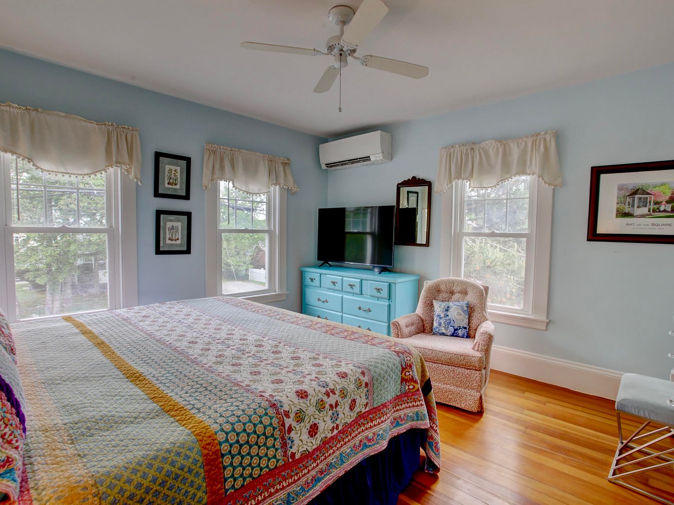 A bright and inviting bedroom featuring soft pastel blue walls and shining honey-colored hardwood floors. Large windows with simple off-white valances allow natural light to flood the room, highlighting the airy atmosphere. The bed is covered with a vibrant, patterned quilt in shades of pink, gold, red, and blue, providing a cheerful focal point. An aqua blue dresser stands against the far wall, supporting a television and flanked by a mirror and framed artwork. A comfortable tufted armchair with a floral pillow sits nearby, enhancing the cozy ambiance. The ceiling fan adds a practical touch, completing the relaxed, vintage-inspired aesthetic.