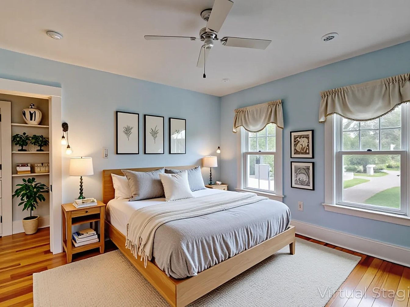 A spacious, sunlit bedroom features pale blue walls paired with crisp white trim and crown molding, creating a serene atmosphere. The wooden floor is complemented by a large, cream-toned area rug at the foot of the bed. A platform bed with a light wood frame is dressed in soft gray linens and several plump pillows. Two bedside tables, each with a stylish lamp, flank the bed. Above the headboard, three minimalist botanical prints hang in a row. Built-in shelves in a cozy alcove hold books and potted plants. Two large windows with ruffled valances fill the room with natural light and offer a view of a landscaped yard.