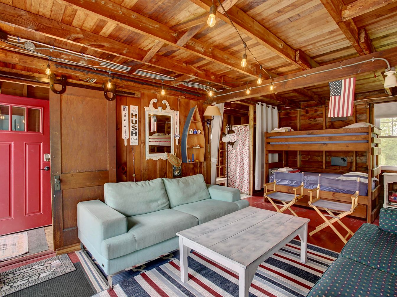 A rustic room with exposed wooden beams and walls features a cozy, casual atmosphere. A vintage light blue sofa sits atop a striped area rug, paired with a distressed white wood coffee table. Bunk beds with blue bedding and two wooden director’s chairs line the wall. The décor includes a red front door, wall signs, and an American flag, adding a nostalgic Americana charm. There’s a built-in shelving unit with small decorative items and a wall-mounted mirror with a curved white frame. The ceiling lights hang from exposed wiring, adding industrial character to the space, complementing the vintage camp vibe.