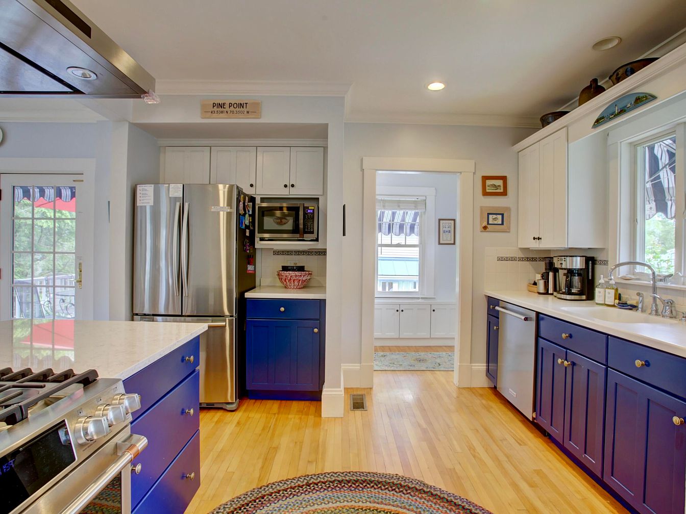 A bright, inviting kitchen features lower cabinets painted a bold cobalt blue, contrasted by crisp white upper cabinets and white countertops. The floor is made of light hardwood, contributing to an airy and spacious feel, complemented by a round braided rug in soft, earthy tones. Stainless steel appliances, including a refrigerator and dishwasher, add a modern touch to the space. Above the sink, a wide window brings in natural light, framed by simple white trim. A sign reading “Pine Point” sits above the cabinetry. Decorative plates, a coffee station, and framed art add charm and personality to the room.