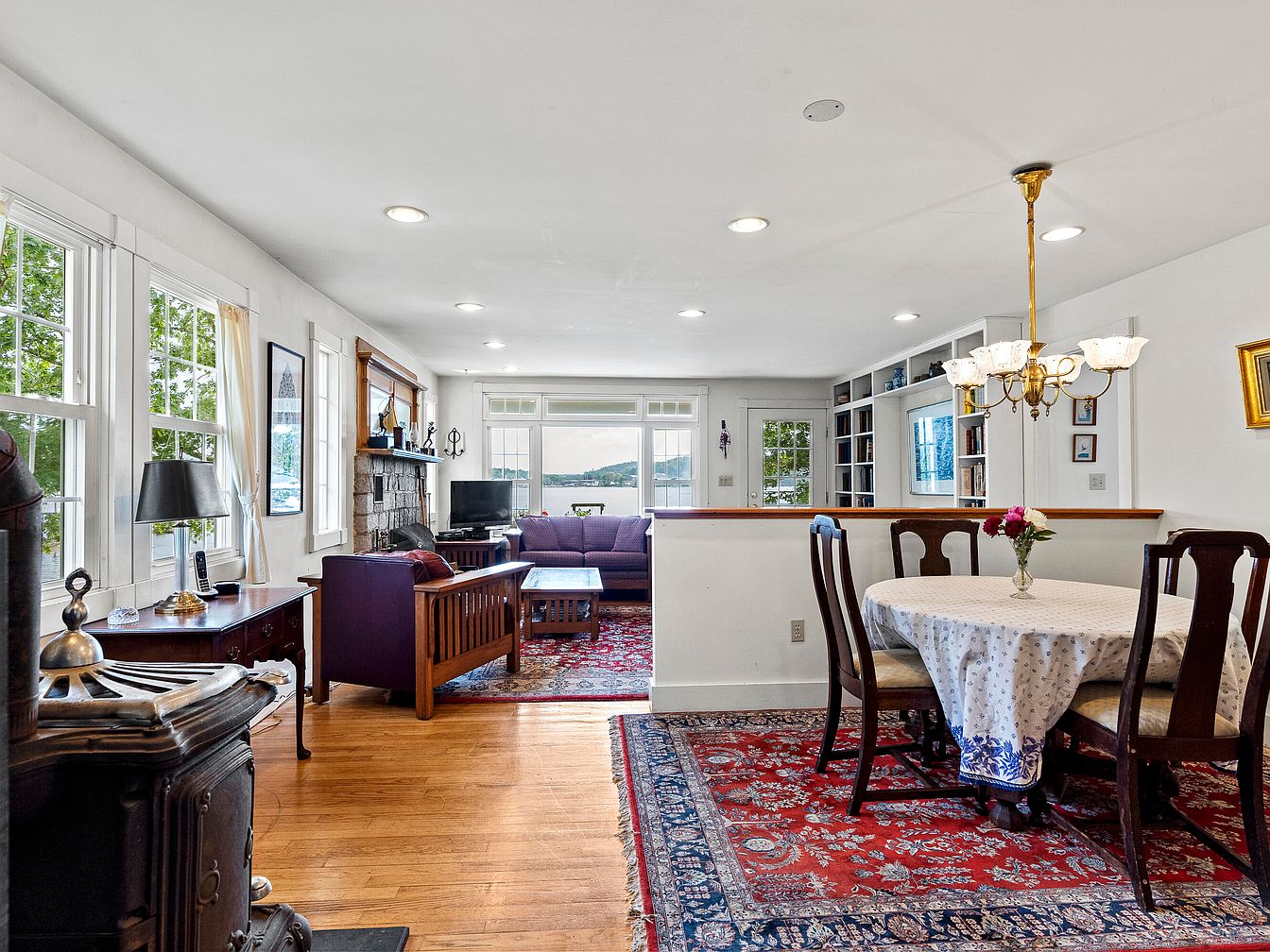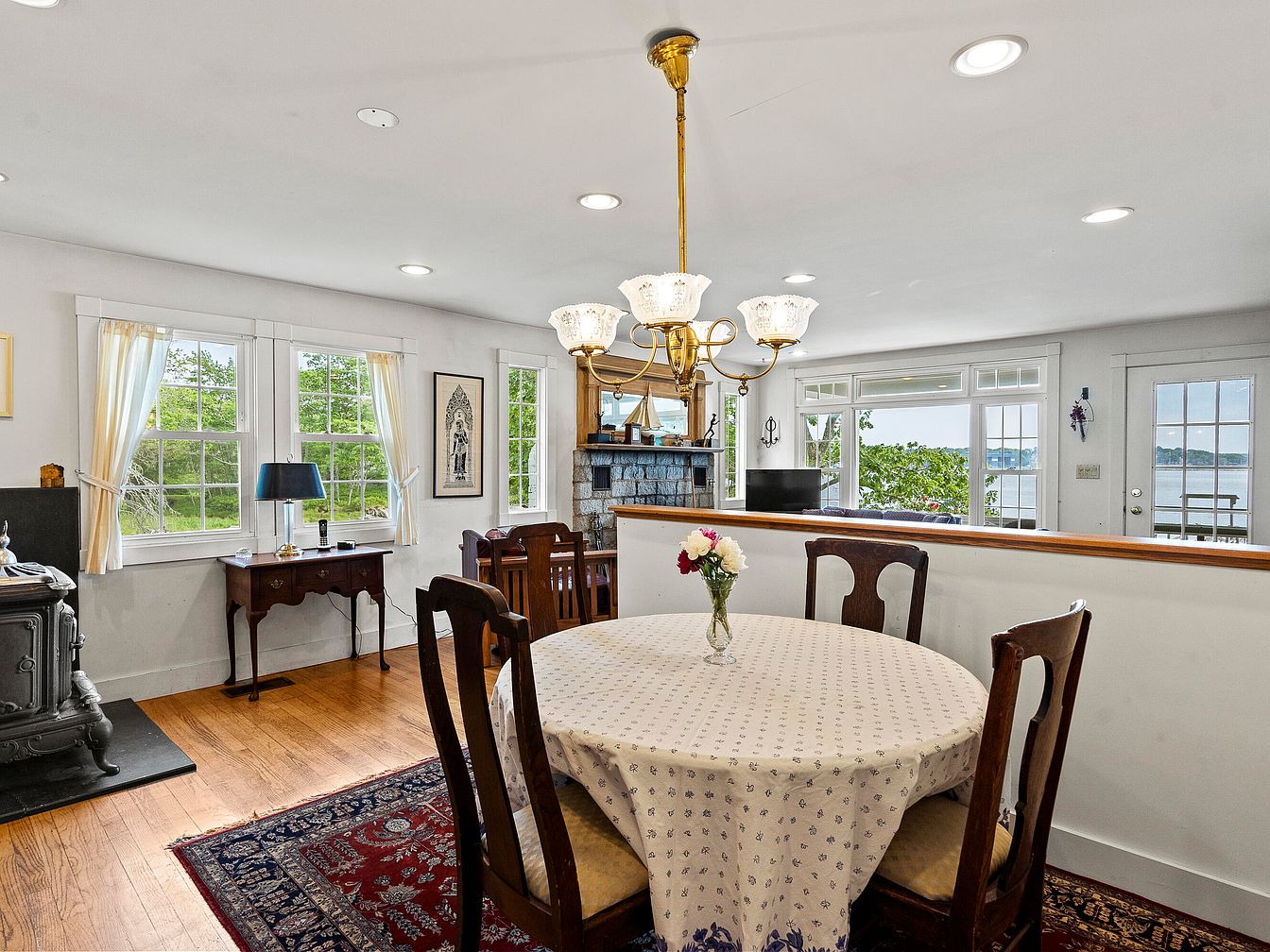 A bright, traditional dining nook with a round table draped in a patterned white cloth and surrounded by four wooden chairs sits atop a richly colored oriental rug. Overhead, an ornate brass chandelier with frosted glass shades provides gentle illumination. Light streams through large, multi-pane windows dressed with soft, white curtains, offering a lush green view outside. The far side of the open layout reveals a cozy seating area with a stone fireplace and a lamp-topped side table. Glass doors and transom windows along the back wall showcase scenic waterfront views, contributing to a welcoming and airy ambiance.