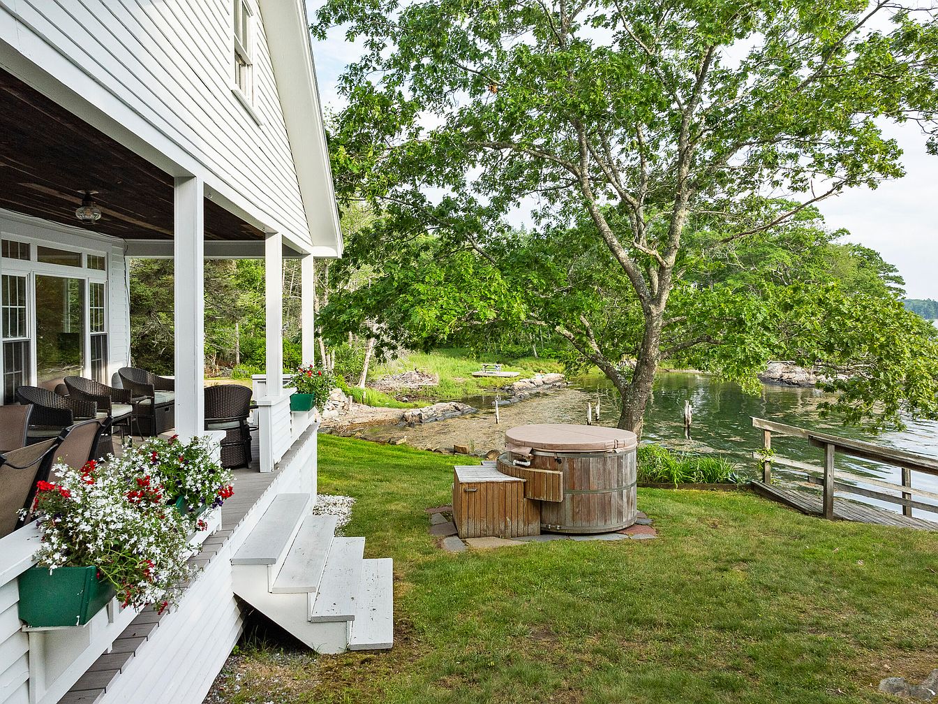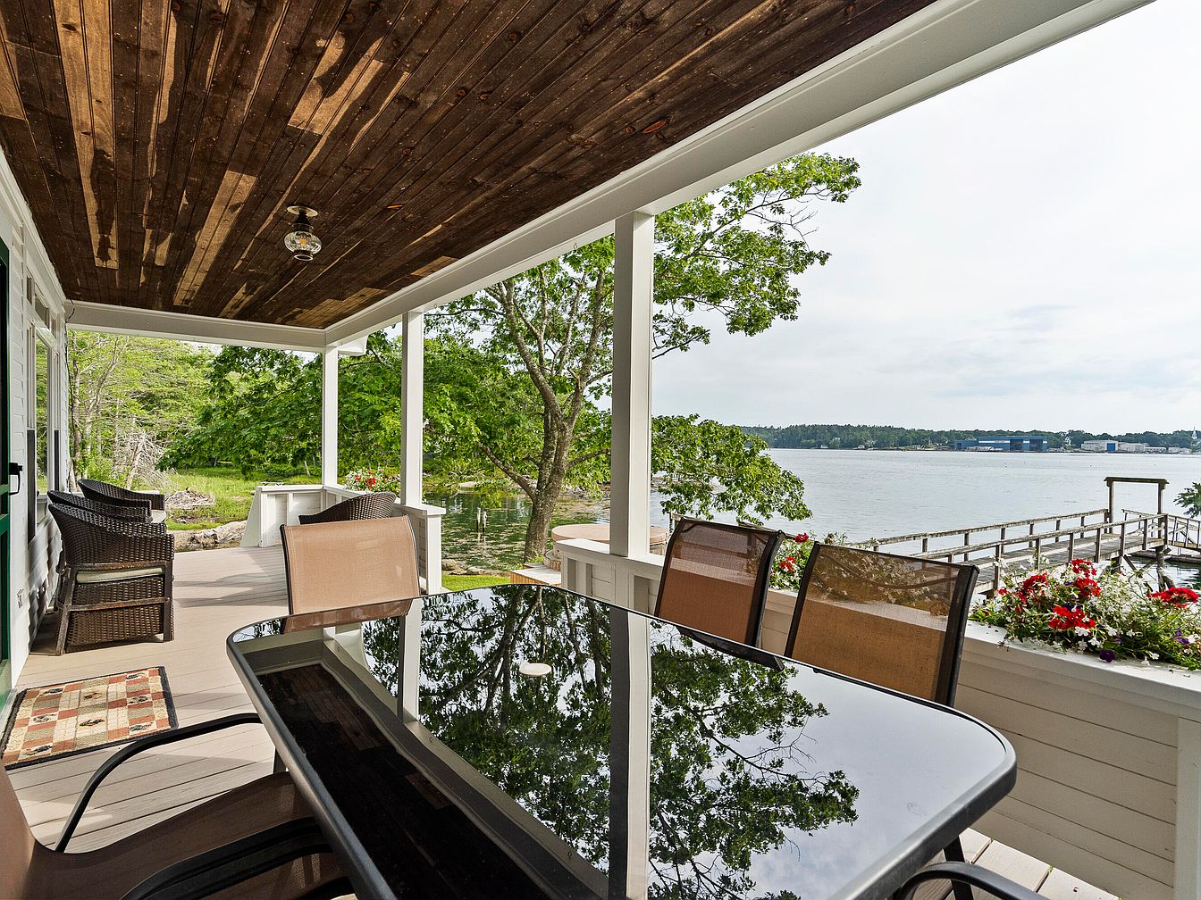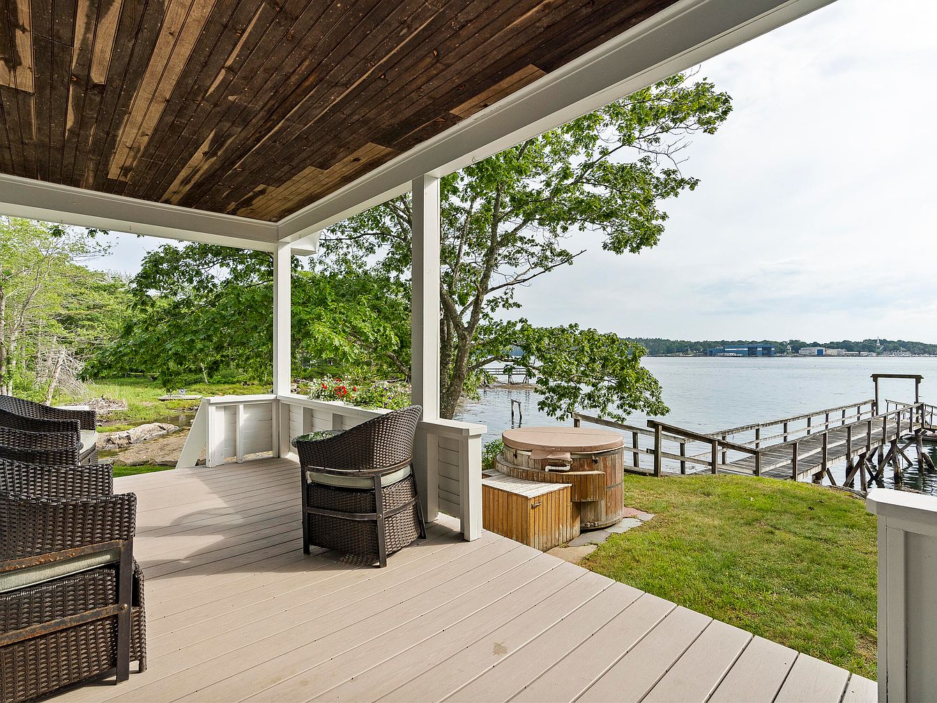 A wide, covered porch featuring a plank wood ceiling and pale gray composite flooring overlooks a tranquil waterfront. Dark wicker armchairs with light-colored cushions provide comfortable seating along the porchโs edge. The space is open to the grassy yard, where a round wooden hot tub and matching bench nestle beside a rail fence leading to a wooden dock extending out over the water. Mature trees and lush greenery surround the porch, framing serene water views and distant buildings across the bay. The neutral tones and natural materials create a warm, inviting, and relaxed coastal retreat.