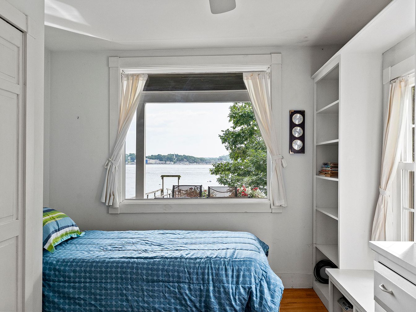A small, cozy bedroom featuring a single bed with a blue comforter and a pillow accented with green and white stripes. The focal point is a large window framed by simple white curtains, offering an expansive view of a body of water and a distant shoreline with trees and buildings. On the right side, built-in white shelving holds a few books and small items. Natural light fills the room, enhancing the bright, minimalist aesthetic. The walls and ceiling are painted white, while warm wood flooring adds contrast. The overall atmosphere is serene and inviting, with an emphasis on the scenic outdoor view.