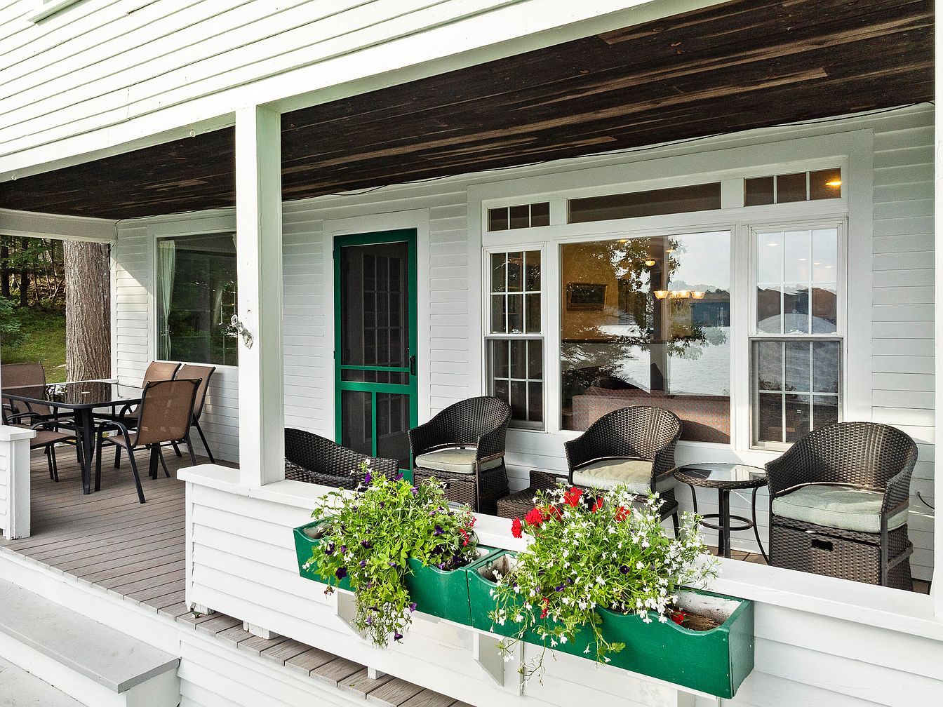 A spacious front porch features light gray wooden decking and crisp white siding contrasted by a dark wood ceiling. Green accents are present in the trim of the screen door and two large planter boxes filled with vibrant red and white flowers. Three black wicker chairs with pale green cushions are arranged around a small circular glass table, creating a cozy sitting area. To the left, a square dining table with brown cushioned chairs rests near a large window. The porch overlooks calm water, visible through wide divided pane windows that reflect interior lighting and lakeside views, suggesting a peaceful and inviting outdoor retreat.