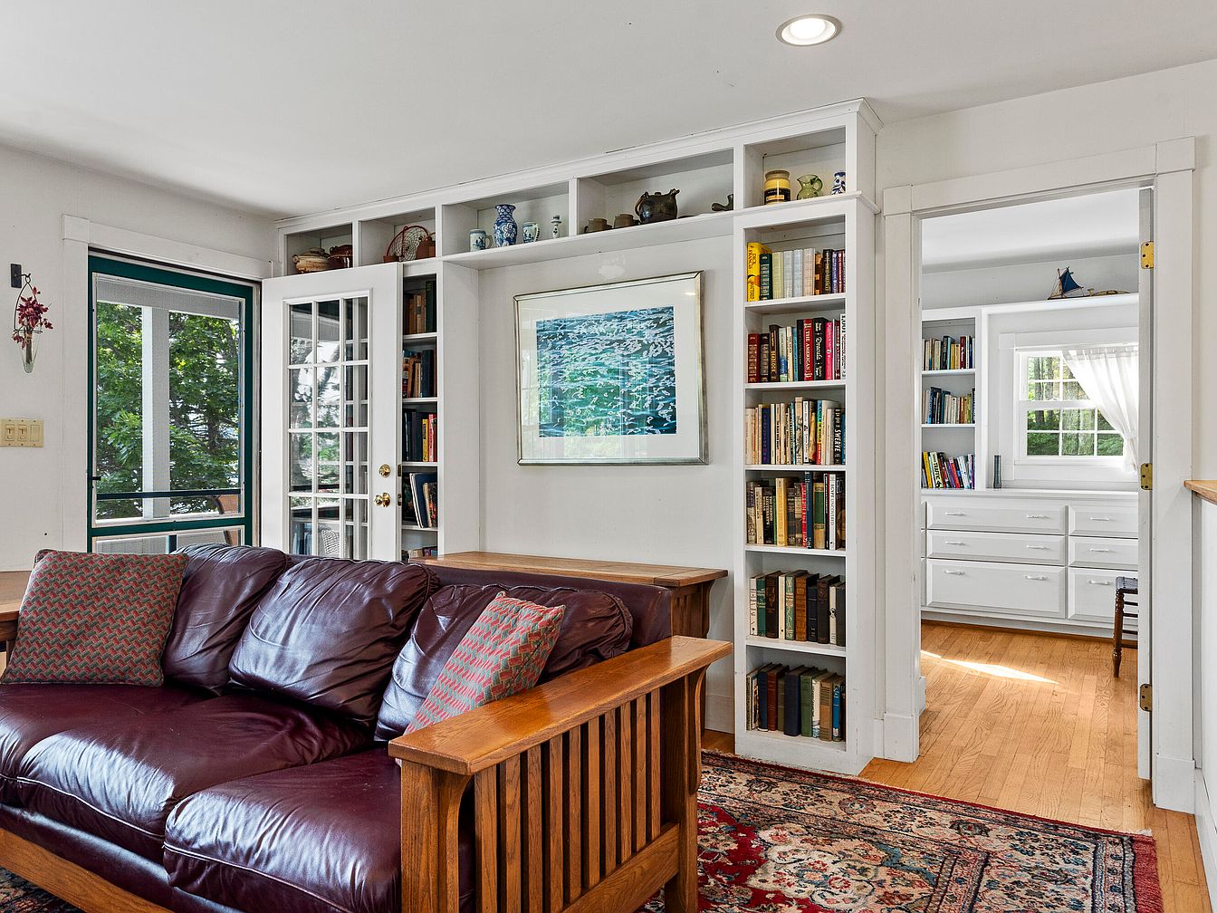 A cozy living area featuring a deep burgundy leather sofa with wooden arms and three patterned accent pillows. Built-in white bookshelves flank a center section with a large ocean-themed framed print hanging above the sofa. The shelving displays an assortment of books and decorative pottery. French doors with glass panes open up to a screened porch, allowing light to filter through. The adjacent room, visible through a wide doorway, continues with built-in cabinetry and shelving, topped by a bright window dressed in sheer white curtains. The floor is a warm wood, complemented by a traditional patterned area rug in muted reds and blues.