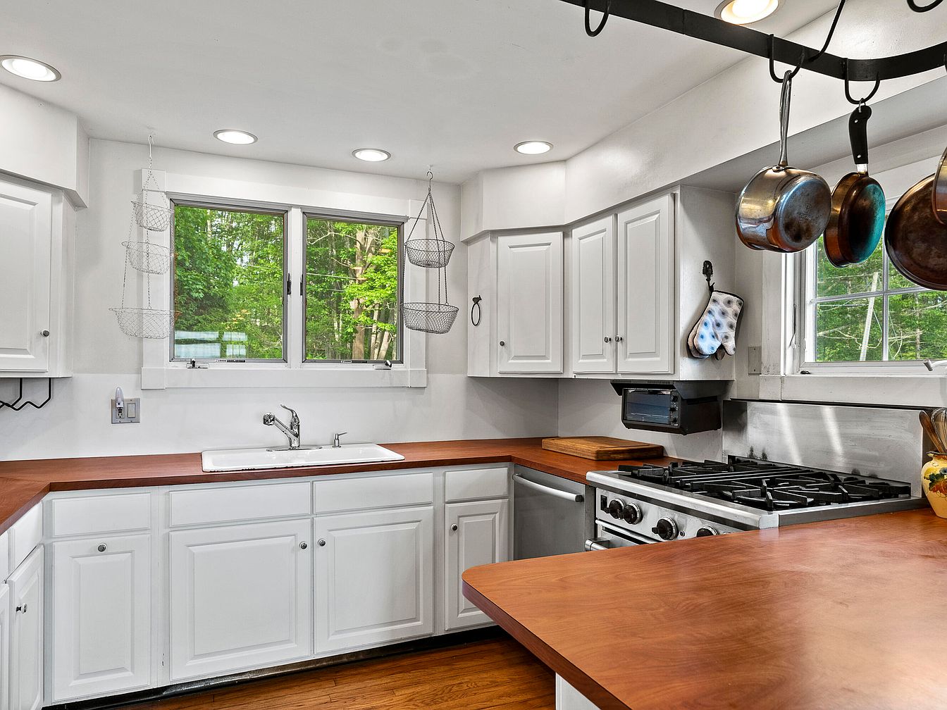 A bright and inviting kitchen corner features ample white cabinetry with recessed panel doors, set against natural wood countertops. The L-shaped workspace is arranged beneath large windows that flood the area with daylight and provide a green forested view. Hanging metal baskets flank the main window above a white porcelain sink, adding a touch of functional charm. Above the gas range, stainless steel cookware hangs from a black utensil rack, contributing a rustic touch. Recessed lighting in the ceiling offers focused illumination, while the overall palette of white, wood, and metallics creates a clean, harmonious atmosphere with a sense of warmth and openness.