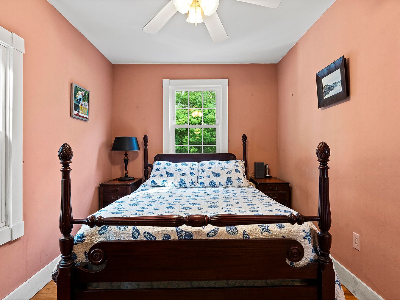 A cozy bedroom features walls painted a warm peach tone, evoking a historic charm. The centerpiece is a wooden four-poster bed with turned posts, dressed in a quilt with blue seashell and starfish patterns on a white background. Flanking the bed on each side are matching dark wood nightstands, one with a classic black table lamp and the other topped with a small appliance. Above the nightstands, framed artwork and photographs add character. A large double-hung window with white trim fills the room with natural light and offers a view of lush green trees. A ceiling fan hangs overhead, complementing the bright and inviting atmosphere.