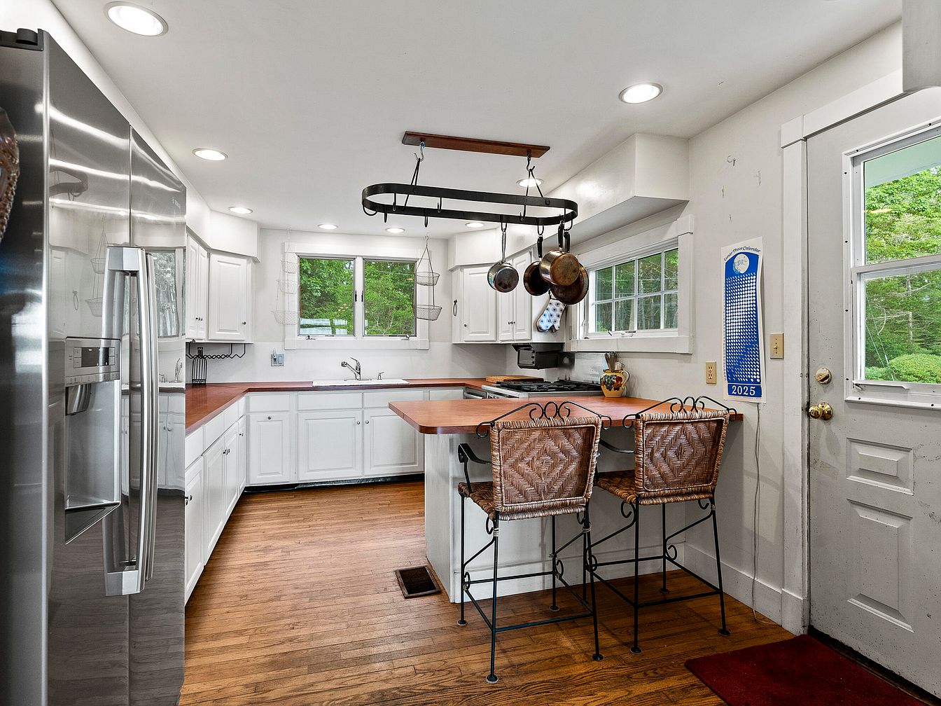 A bright and open kitchen features white cabinetry, spacious wooden countertops, and a large stainless steel refrigerator on the left. Woven barstools with black metal frames sit at a breakfast bar that extends from the main counter, facing into the kitchen. Overhead, a rack suspended from the ceiling holds copper and metal pots, adding rustic charm. Warm, honey-toned wood floors extend throughout the room, complementing the natural light from large windows above the sink and countertop. A back door and a vertical blue calendar on the wall create a functional, lived-in atmosphere. The overall ambiance is cozy, clean, and inviting.