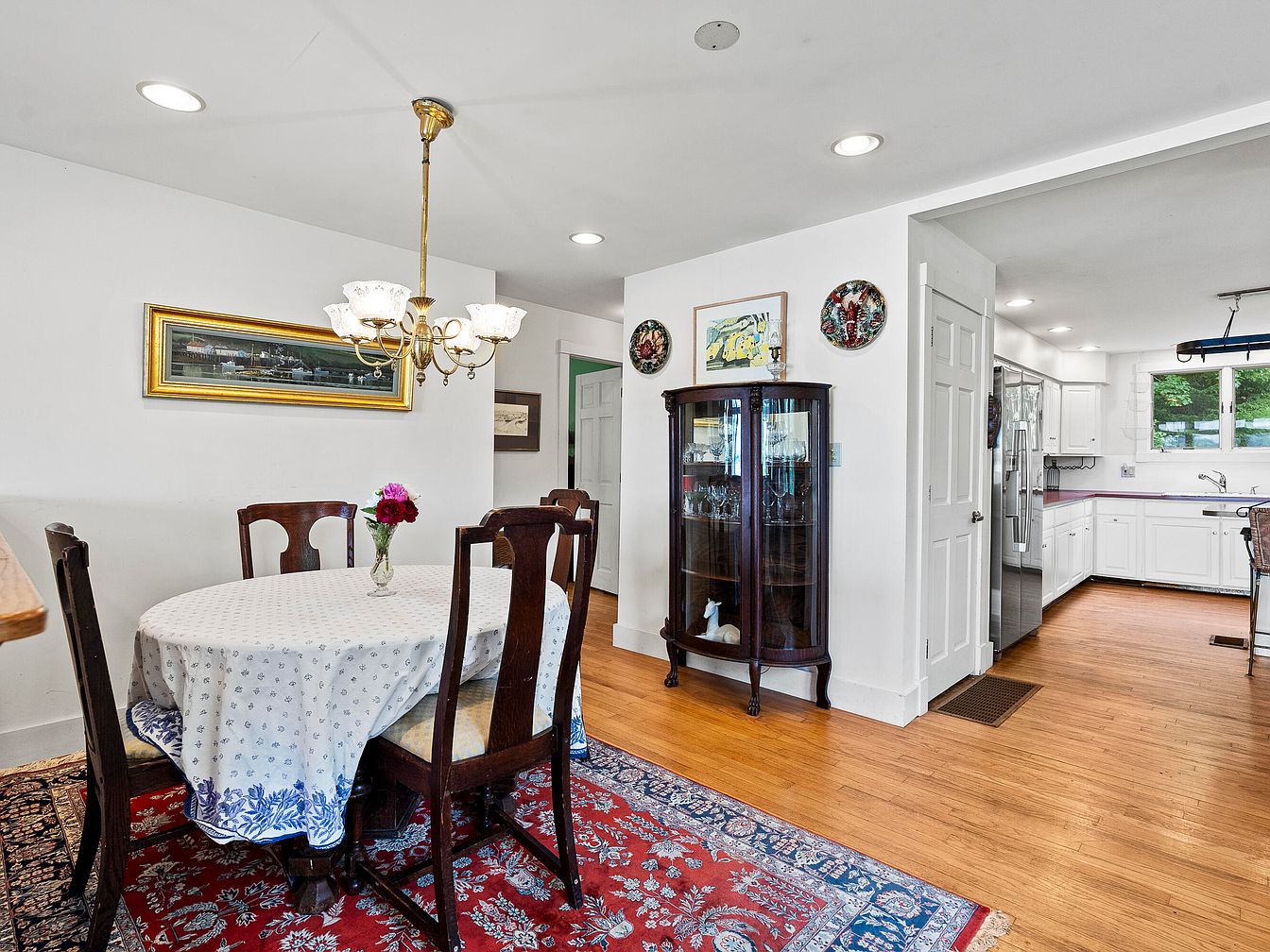 An intimate dining space features a round wooden table covered with a white tablecloth adorned with a blue floral border, surrounded by four dark wood chairs with cream upholstered seats. A large, ornate red and blue Persian-style rug anchors the area, while above, a brass chandelier with frosted glass shades provides elegant lighting. The walls are crisp white, accented by a gold-framed landscape painting and a glass-fronted china cabinet displaying glassware and ceramics. To the right, the area seamlessly connects to a bright kitchen with white cabinetry, stainless steel appliances, and large windows bringing in natural light. The overall atmosphere feels classic and welcoming.