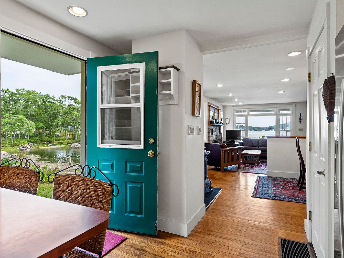 Bright entryway with a teal door featuring window panes leads to a view of tranquil water and lush greenery outside. Inside, the space is airy with white walls and warm, honey-toned hardwood floors. Rattan dining chairs and a wooden table sit near the entry. Down the hall, the living room is furnished with a plush sectional sofa, wooden mission-style furniture, and showcases a cozy stone fireplace. Two large rugs with intricate patterns add color. Large windows overlook scenic water views, letting natural light fill the room, creating a fresh and welcoming ambiance with traditional elements.