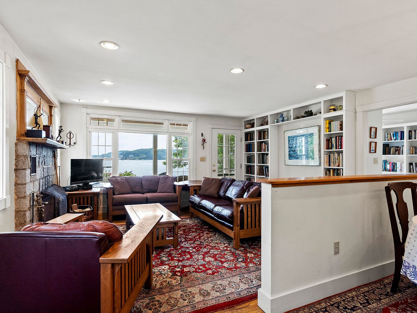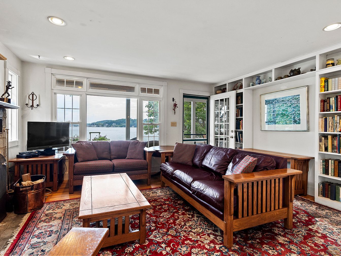 A cozy living room with large windows facing a waterfront, providing abundant natural light and scenic views. The space features built-in white bookshelves filled with books and decorative objects, a deep red and cream patterned area rug, and sturdy wooden Mission-style furniture, including a sizable sofa and loveseats upholstered in dark leather and patterned fabric. A wooden coffee table matches the end tables and TV stand, which supports a flat-screen television. Subtle recessed ceiling lights and white walls contribute to a bright and open feel, while artwork and pottery add character to the space. French doors open onto a leafy outdoor area.