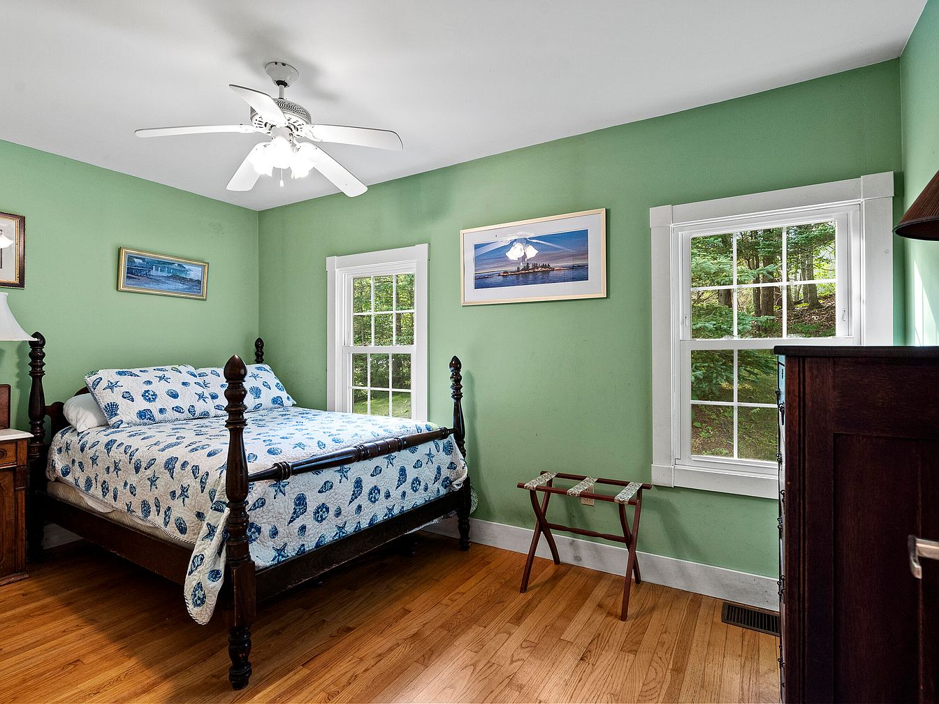 This is a cozy bedroom featuring sage green walls and bright white trim that highlights two large windows, allowing plenty of natural light to enter. A dark wood four-poster bed with a sea-inspired blue and white quilt is positioned against one wall, accompanied by matching pillows. On the left side, a wooden nightstand with a classic lamp adds a warm accent. The hardwood flooring contrasts gently with the green walls. Above the bed and on the adjacent wall, landscape paintings in simple gold frames provide a touch of artistry. The space has a ceiling fan, and a wooden luggage rack sits near the window.