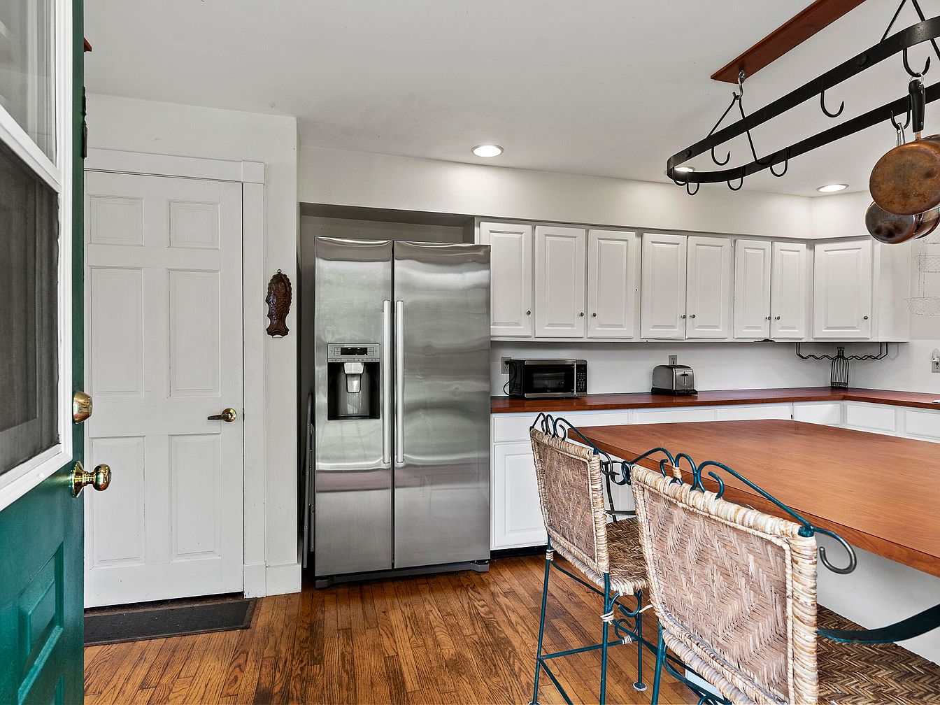 A spacious kitchen features white cabinetry lining the walls, creating a bright and airy feel under soft recessed lighting. The hardwood floor adds warmth and contrasts with the sleek stainless steel refrigerator. A central island with a wooden countertop doubles as a breakfast bar, surrounded by tall stools with woven rattan seats and decorative metal backs. Above the island, a black metal pot rack hangs with several copper pans, hinting at historical charm. The decor is simple and functional, blending classic American farmhouse style with practical modern touches like small appliances and clean lines.