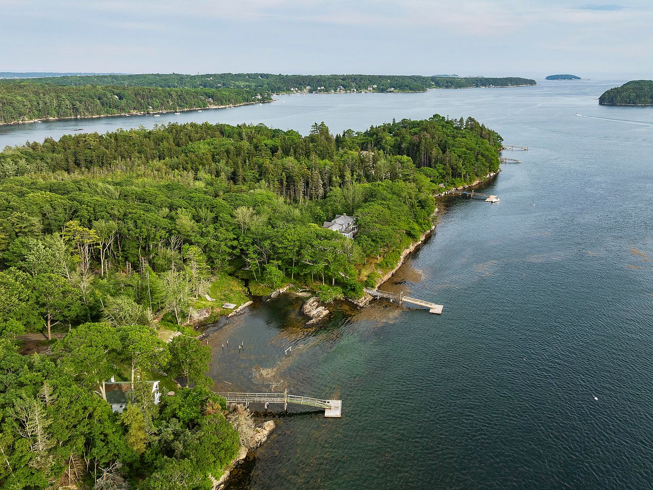 A sweeping aerial view reveals a lush, forested peninsula surrounded on three sides by sparkling blue water. Dense stands of mature trees create a green canopy, partially obscuring several homes nestled along the rocky shoreline. Wooden docks extend from the forest to the water at multiple points, suggesting private access for boats. The shoreline features rocky outcrops and gentle curves, with the natural foliage blending seamlessly into the waterโs edge. Beyond the peninsula, more forested land and clusters of buildings appear on the distant shore, contributing to the serene and secluded atmosphere of this waterfront property.