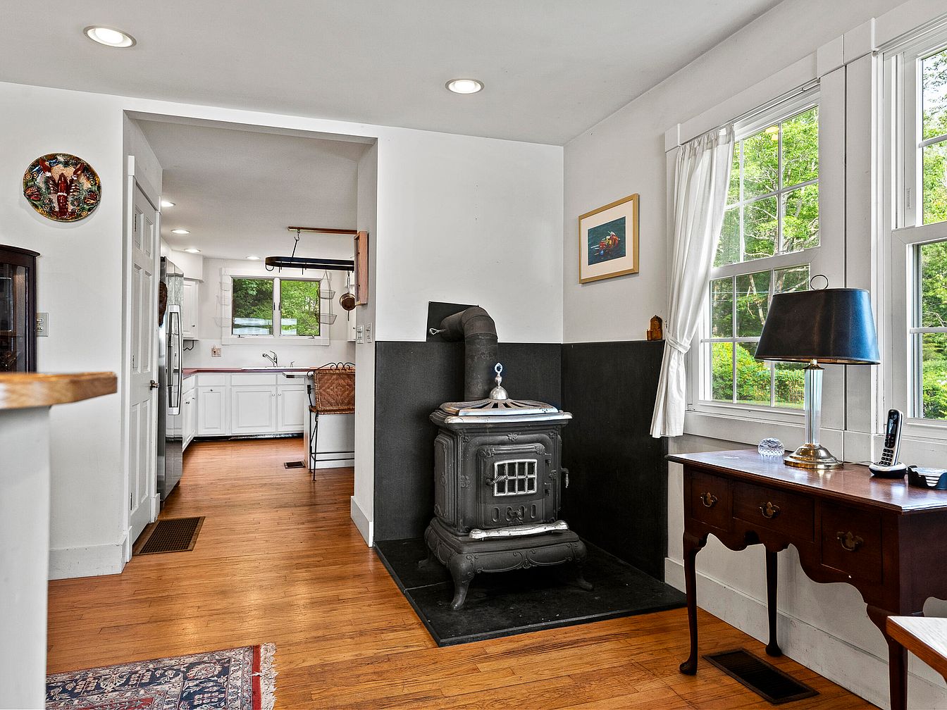 A cozy corner of the kitchen area features an antique cast iron stove resting on a dark-tiled hearth, nestled between white painted walls. Large sash windows framed with crisp white trim and light curtains supply abundant daylight, revealing lush greenery outside. Next to the stove is a traditional wooden desk with curved legs and a black and gold desk lamp, offering a spot for work or reading. Warm wood flooring extends into the adjacent kitchen, where white cabinetry, stainless steel appliances, and a farmhouse sink create a blend of historic and modern aesthetics. The overall palette is bright and welcoming, emphasizing comfort and charm.