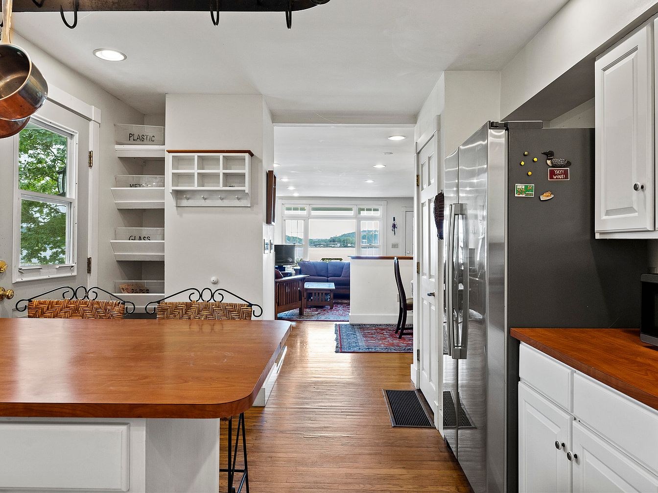 A cozy kitchen with warm wooden countertops and white cabinetry opens into a bright living area. The kitchen features sleek stainless-steel appliances, wicker-backed bar stools, and a corner with labeled recycling bins for glass, metal, and plastic. The walls are painted crisp white and the natural light from a nearby window enhances the fresh atmosphere. Beyond the kitchen, wooden floors flow into the living room, where a blue sectional sofa and a Persian-style area rug create an inviting seating space. Large windows in the distance overlook a tranquil landscape, infusing the home with light and scenic views.