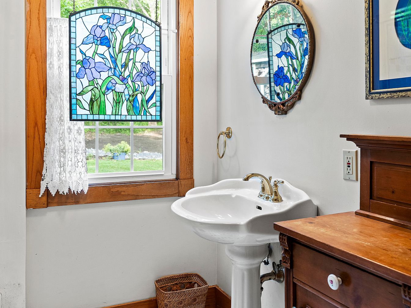 A quaint bathroom corner featuring a pedestal sink with brass hardware, positioned beside a medium-tone wood vanity or dresser. To the left, a window framed in natural wood lets in light and greenery, while a decorative sheer lace curtain provides a vintage touch. Hanging in the window is a striking piece of stained glass art in cool blues and greens, depicting irises, and complementing the round, ornate-framed wall mirror which reflects the stained glass as well. The overall color scheme is bright and inviting, emphasizing white walls, natural wood, and artistic floral details for a charming, classic look.