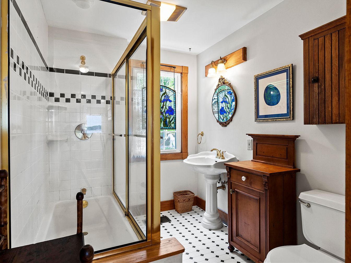 This bathroom features a white pedestal sink with gold-tone fixtures and traditional wood cabinetry. The black-and-white hexagonal tiled floor lends a classic look, coordinating with the black-and-white accent tiles that run along the upper shower wall. The spacious shower has a glass door framed in gold, while the window over the sink is framed in warm wood and adorned with a lace curtain. Above the sink, stained glass artwork and framed art pieces add a vibrant, historic touch. The lighting fixture and wood medicine cabinet enhance the vintage, period-correct feel of the room, blending functionality and character.