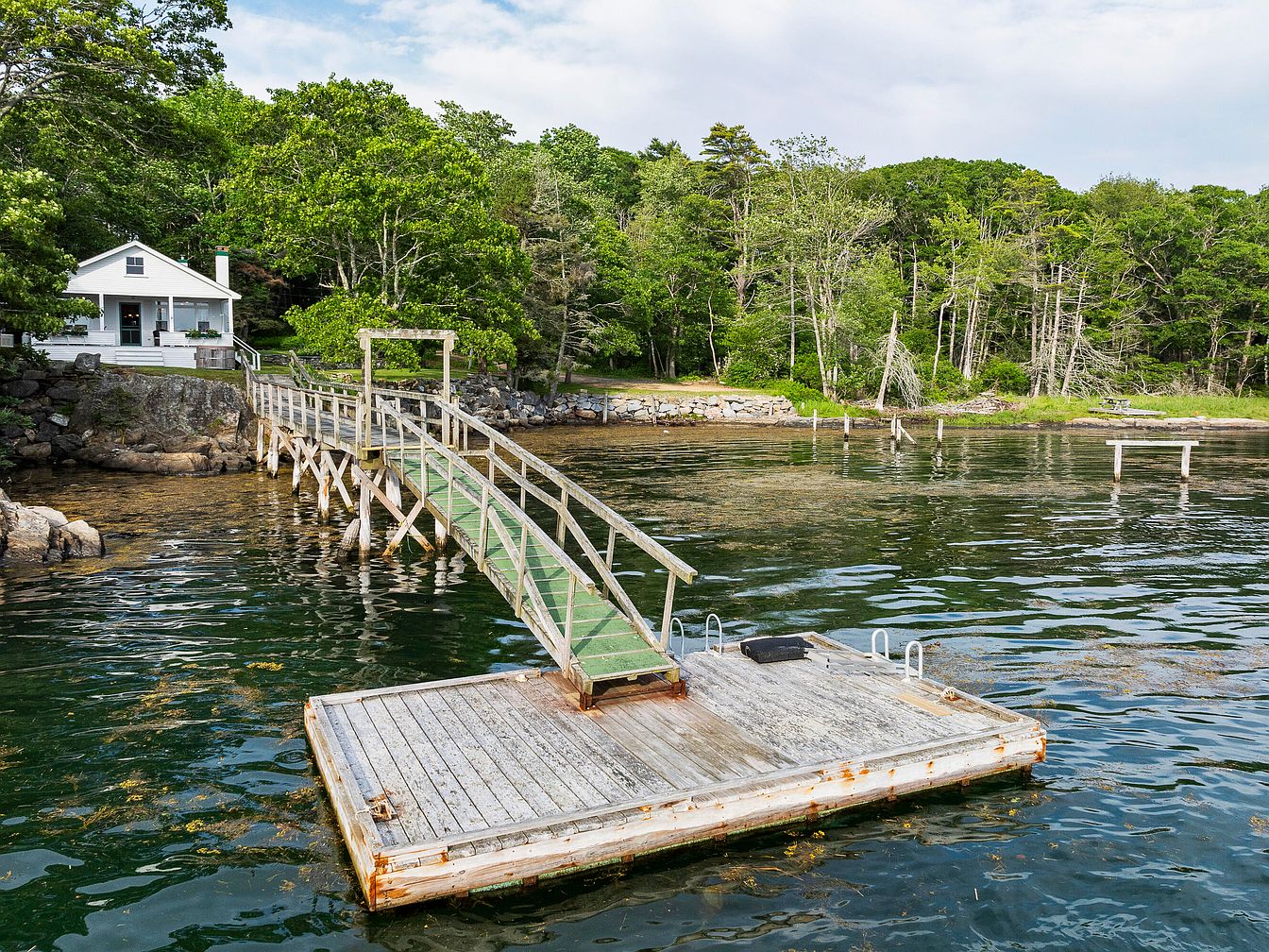 A long wooden dock stretches over calm green-blue coastal waters, leading from a floating platform to a charming white cottage set amid lush trees. The dock is supported by wooden pilings and features a simple railing with a green mat runner. The floating platform at the waterโs edge has metal ladders for easy access to the water and displays gentle weathering, suggesting frequent use. The cottage, perched on rocky terrain above the shoreline, boasts a wide porch and a large window, blending seamlessly with the natural landscape. An atmosphere of tranquility and classic waterfront living is strongly evoked.
