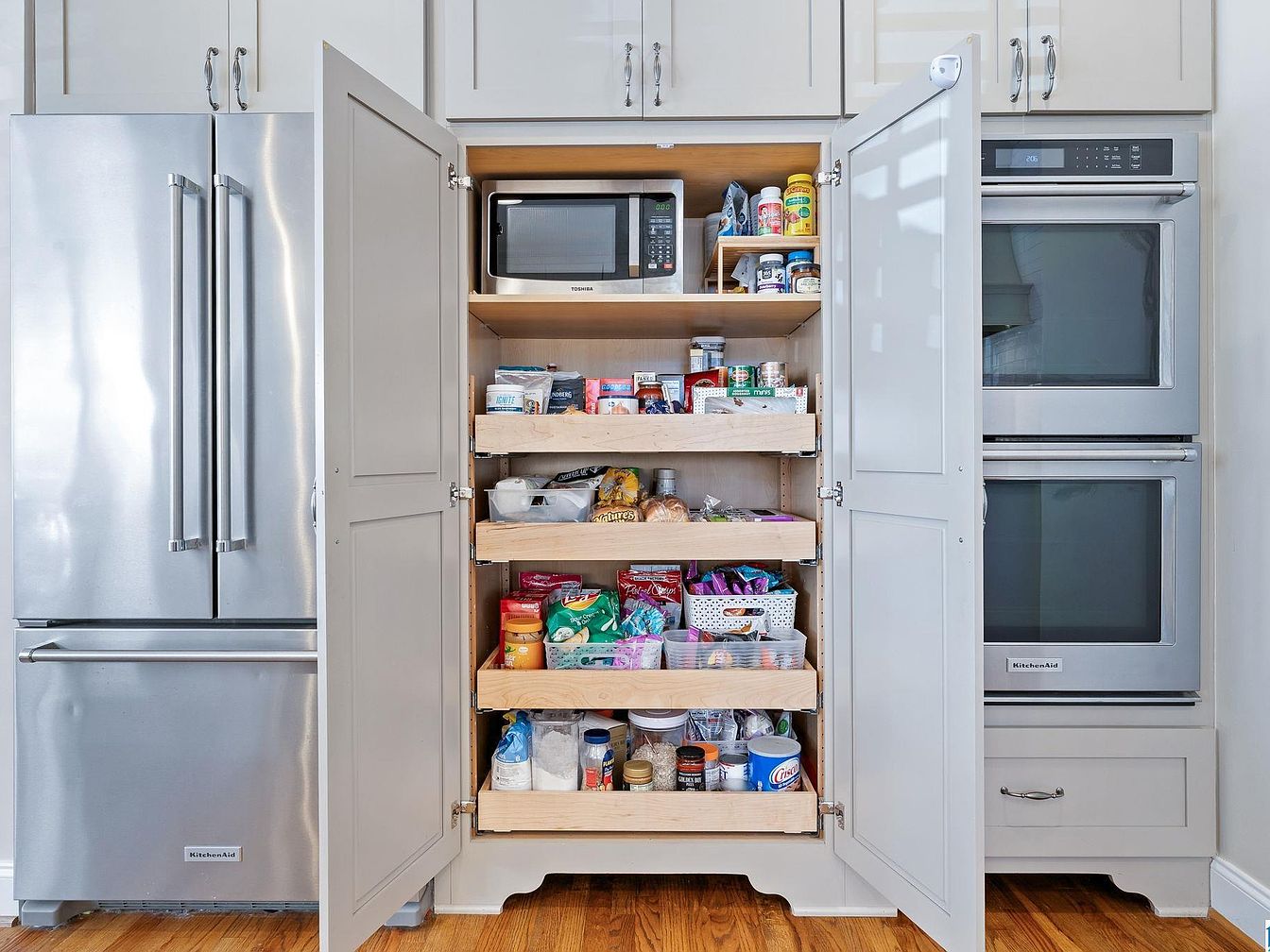 An open pantry with pull-out wooden shelves is neatly organized with snacks, cans, and dry goods categorized in baskets and containers. The shelving is enclosed within shaker-style light gray cabinetry, which matches the adjacent cabinetry above and below the pantry. On the left, a modern stainless steel French-door refrigerator sits flush with the cabinetry, enhancing a clean, cohesive look. To the right, a stacked stainless steel double wall oven is built in, with a microwave situated on the pantry’s top shelf. The overall kitchen design is bright and inviting, featuring natural wood flooring and soft gray tones for a classic, functional aesthetic.