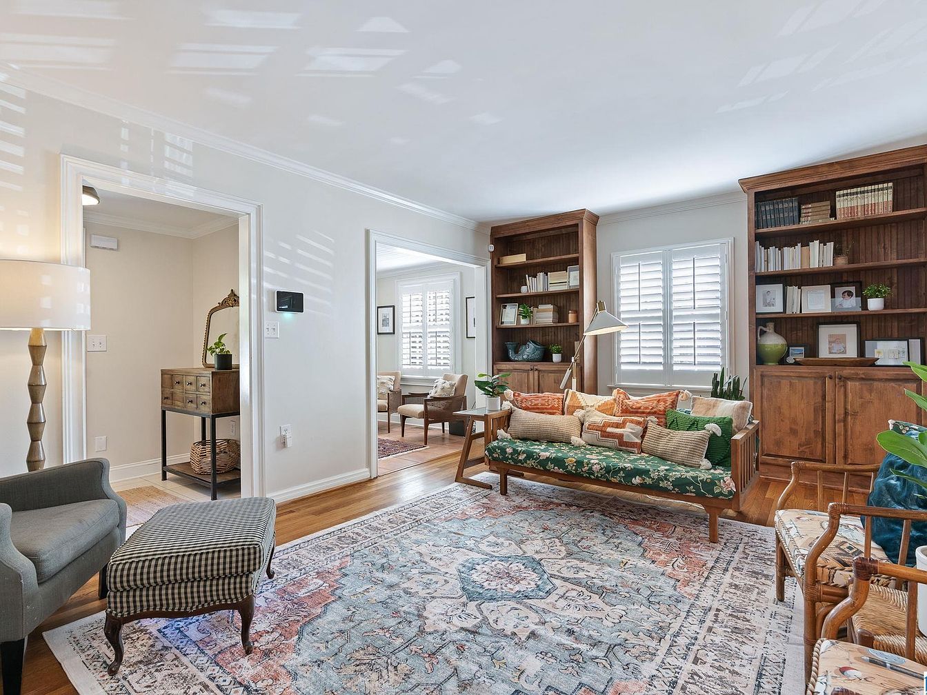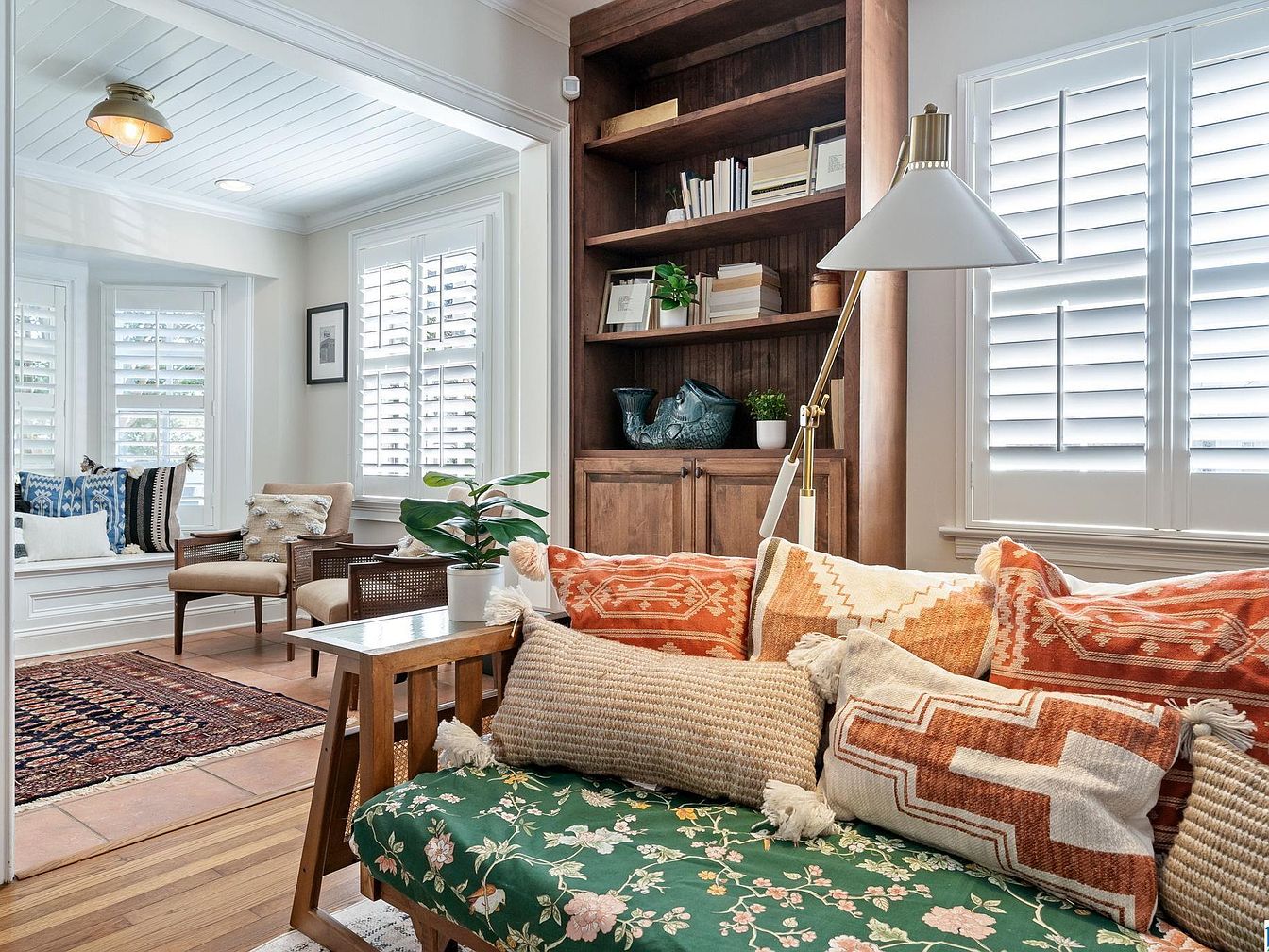A cozy living space featuring a green floral sofa adorned with a variety of textured pillows in burnt orange, cream, and beige. The room is bright, illuminated by large windows with white plantation shutters allowing natural light to filter in. A sleek mid-century modern floor lamp stands beside the sofa. Built-in wooden shelves with books and decorative items complement the warm wood tones throughout. In the background, a sitting area with cushioned armchairs, a dark oriental rug, and more patterned pillows creates a layered, inviting atmosphere. White trim, wooden floors, and touches of greenery complete the look, evoking comfort and historic charm.