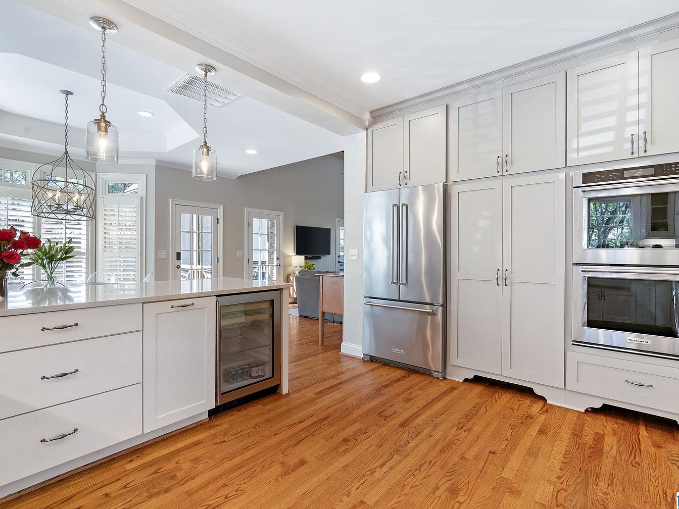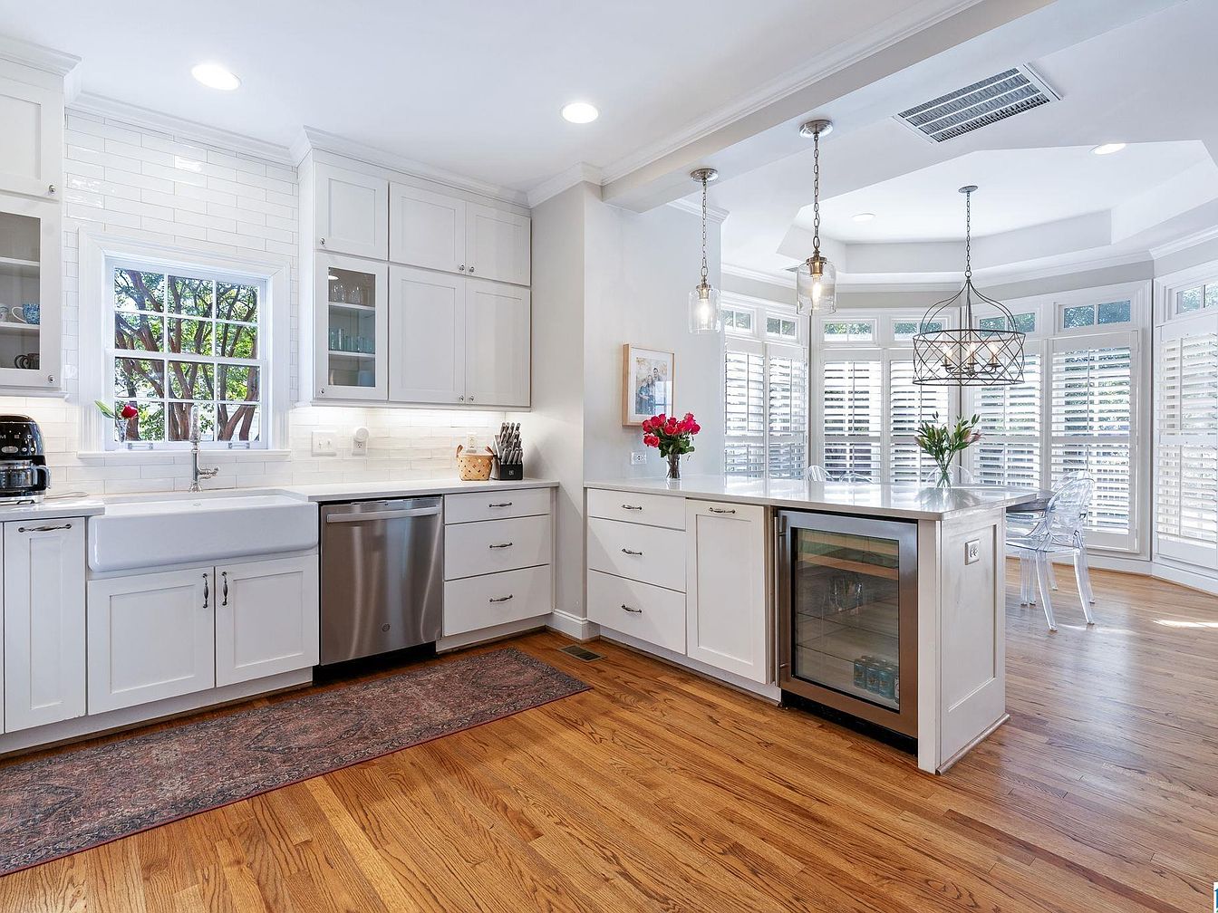Crisp white cabinetry and gleaming stainless steel appliances create a clean, modern look in this airy kitchen. A farmhouse sink sits under a window with a view of leafy trees, while white subway tiles line the backsplash. Sleek silver drawer pulls and minimalist hardware contribute to the streamlined aesthetic. An island with storage and a glass-front beverage fridge separates the kitchen from a sun-filled breakfast nook, highlighted by a geometric metal chandelier and bay windows with plantation shutters. Warm hardwood floors anchor the space, and pops of color come from fresh flowers on the counters and a patterned runner.